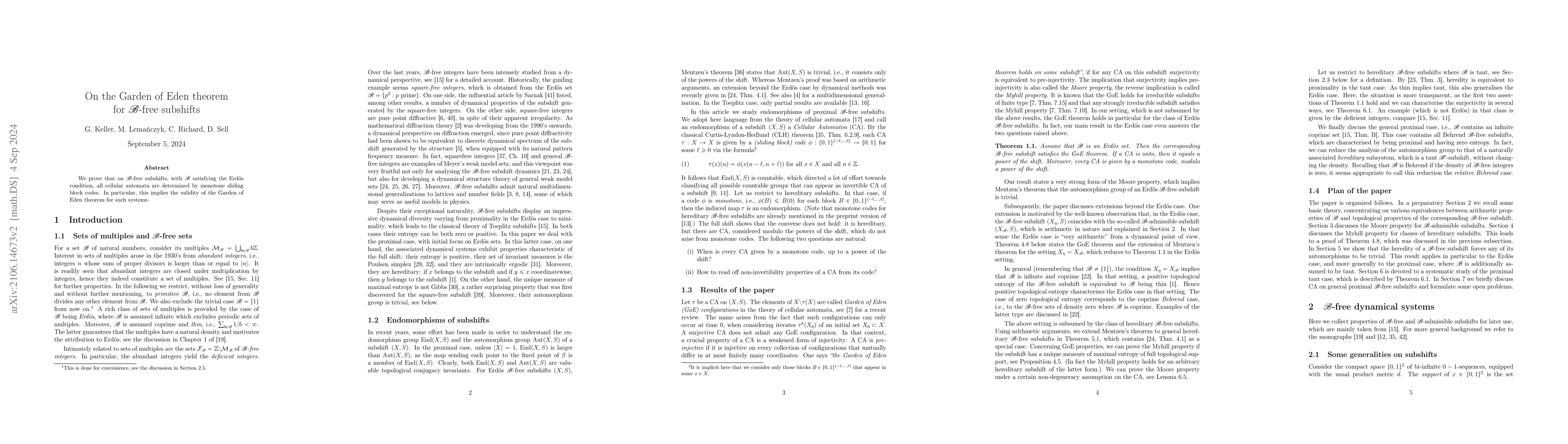 The paper proves that cellular automata on B-free subshifts, where B meets the Erdős condition, are determined by monotone sliding block codes, thereby validating the Garden of Eden theorem for these systems.