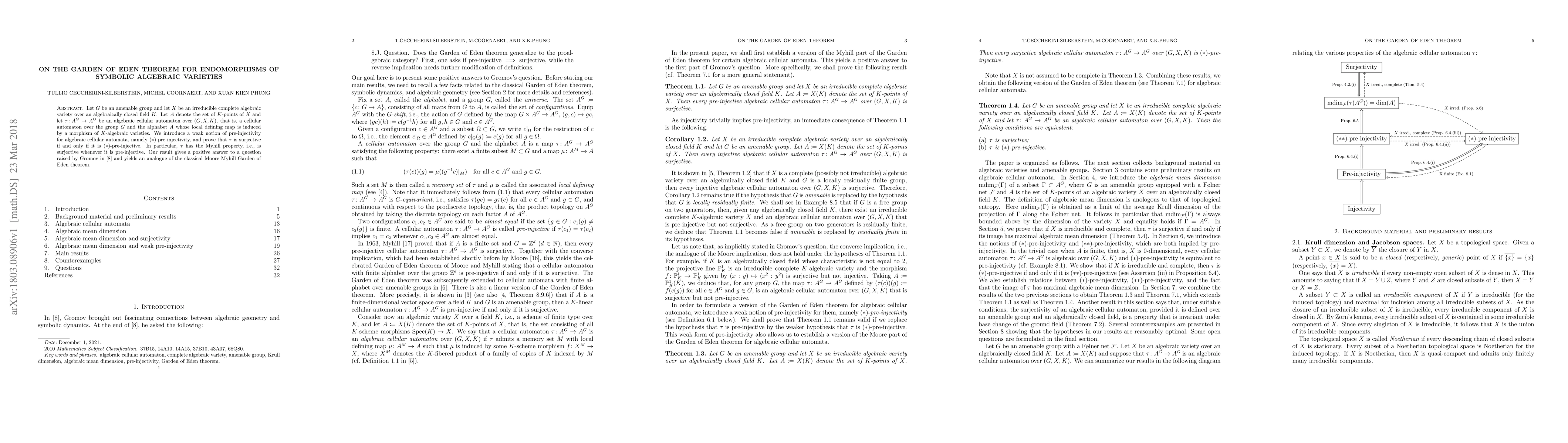 This paper proves that an algebraic cellular automaton $\tau$ over an amenable group $G$ and an irreducible complete algebraic variety $X$ is surjective if and only if it is $(*)$-pre-injective, establishing a Garden of Eden theorem analogue for algebraic endomorphisms.