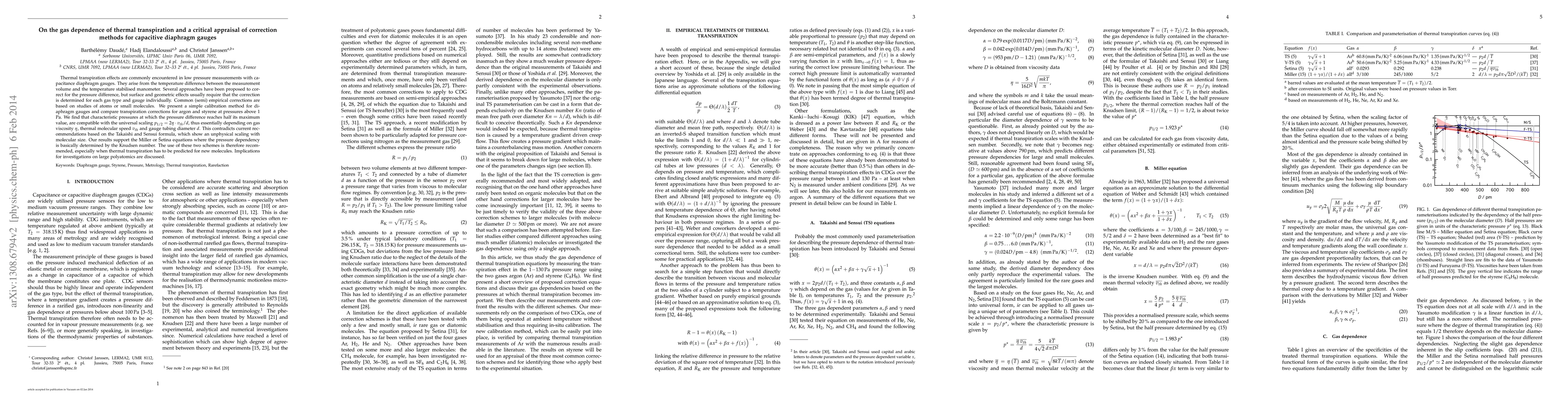 Thermal transpiration effects are commonly encountered in low pressure measurements with capacitance diaphragm gauges. They arise from the temperature difference between the measurement volume and the temperature stabilised manometer. Several approaches have been proposed to correct for the pressure difference, but surface and geometric effects usually require that the correction is determined for each gas type and gauge individually. Common (semi) empirical corrections are based on studies of atoms or small molecules. We present a simple calibration method for diaphragm gauges and compare transpiration corrections for argon and styrene at pressures above 1 Pa. We find that characteristic pressures at which the pressure difference reaches half its maximum value, are compatible with the universal scaling p_{1/2} = 2 \{\eta} \cdot \{v_{th}} / d, thus essentially depending on gas viscosity \eta, thermal molecular speed v_{th} and gauge tubing diameter d. This contradicts current recommendations based on the Takaishi and Sensui formula, which show an unphysical scaling with molecular size. Our results support the Miller or \v{S}etina equations where the pressure dependency is basically determined by the Knudsen number. The use of these two schemes is therefore recommended, especially when thermal transpiration has to be predicted for new molecules. Implications for investigations on large polyatomics are discussed.
