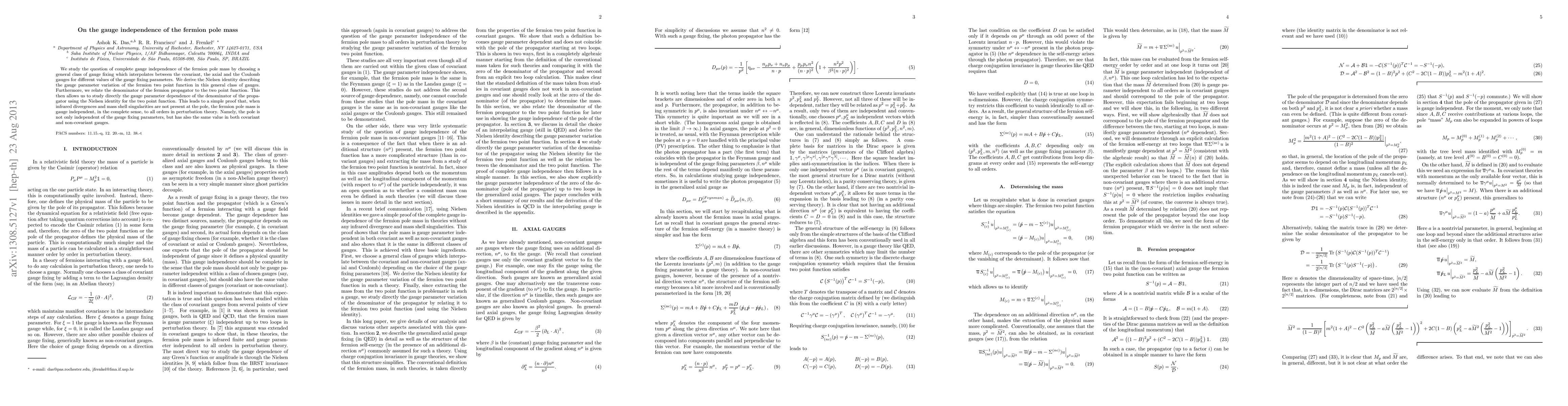 This paper investigates the gauge independence of the fermion pole mass by exploring a general class of gauges. It demonstrates that, in the absence of infrared divergences and mass shell singularities, the fermion pole mass remains gauge independent to all orders in perturbation theory, showing consistency across covariant and non-covariant gauges.