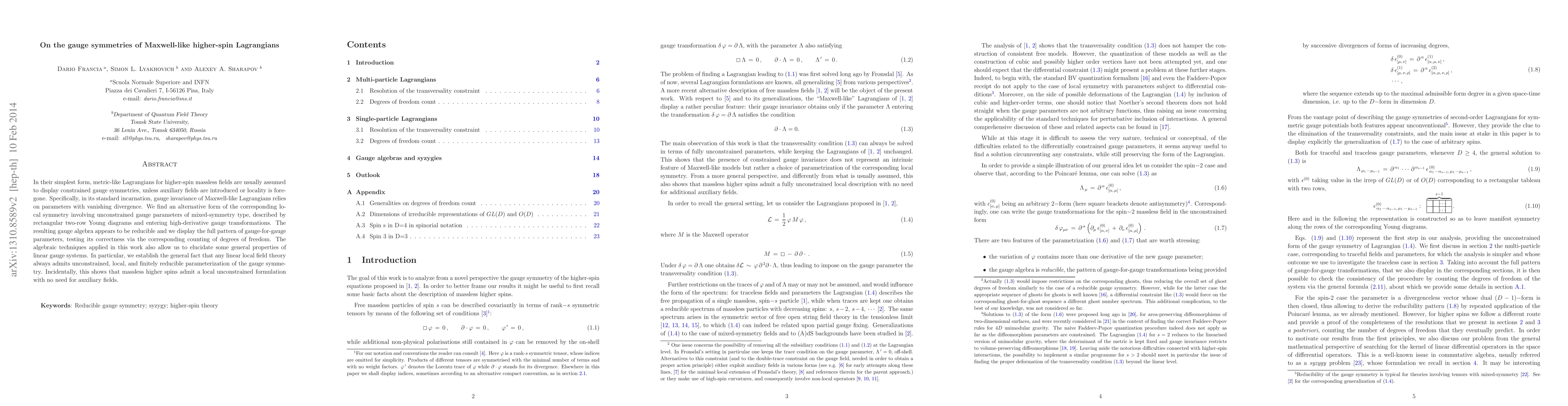 This paper proposes an alternative gauge symmetry for Maxwell-like Lagrangians of higher-spin massless fields, utilizing unconstrained mixed-symmetry parameters instead of auxiliary fields. The resulting gauge algebra is shown to be reducible, confirming a local unconstrained formulation for massless higher spins.