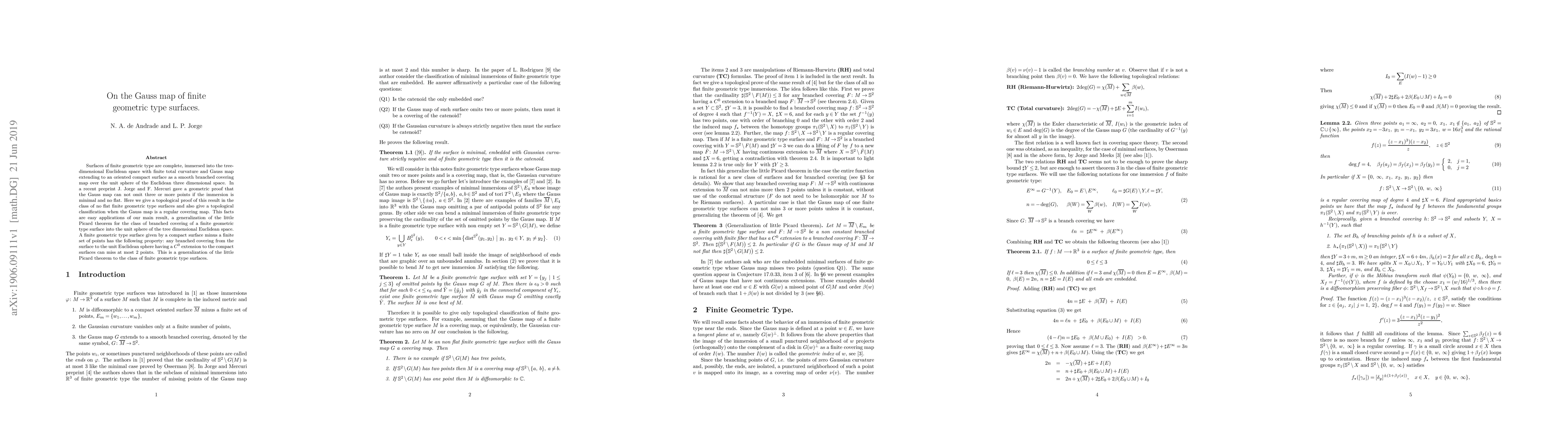 Surfaces of finite geometric type are complete, immersed into the tree-dimensional Euclidean space with finite total curvature and Gauss map extending to an oriented compact surface as a smooth branched covering map over the unit sphere of the Euclidean three dimensional space. In a recent preprint J. Jorge and F. Mercuri gave a geometric proof that the Gauss map can not omit three or more points if the immersion is minimal and no flat. Here we give a topological proof of this result in the class of no flat finite geometric type surfaces and also give a topological classification when the Gauss map is a regular covering map. This facts are easy applications of our main result, a generalization of the little Picard theorem for the class of branched covering of a finite geometric type surface into the unit sphere of the tree dimensional Euclidean space. A finite geometric type surface given by a compact surface minus a finite set of points has the following property: any branched covering from the 0surface to the unit Euclidean sphere having a C extension to the compact surfaces can miss at most 2 points. This is a generalization of the little Picard theorem to the class of finite geometric type surfaces.
