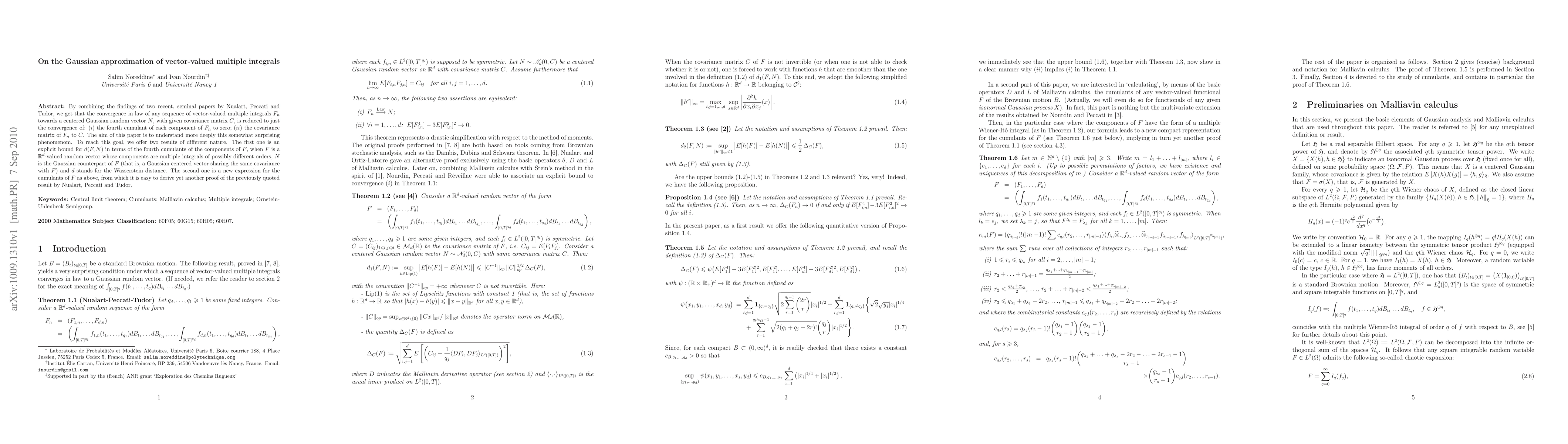 By combining the findings of two recent, seminal papers by Nualart, Peccati and Tudor, we get that the convergence in law of any sequence of vector-valued multiple integrals $F_n$ towards a centered Gaussian random vector $N$, with given covariance matrix $C$, is reduced to just the convergence of: $(i)$ the fourth cumulant of each component of $F_n$ to zero; $(ii)$ the covariance matrix of $F_n$ to $C$. The aim of this paper is to understand more deeply this somewhat surprising phenomenom. To reach this goal, we offer two results of different nature. The first one is an explicit bound for $d(F,N)$ in terms of the fourth cumulants of the components of $F$, when $F$ is a $\R^d$-valued random vector whose components are multiple integrals of possibly different orders, $N$ is the Gaussian counterpart of $F$ (that is, a Gaussian centered vector sharing the same covariance with $F$) and $d$ stands for the Wasserstein distance. The second one is a new expression for the cumulants of $F$ as above, from which it is easy to derive yet another proof of the previously quoted result by Nualart, Peccati and Tudor.