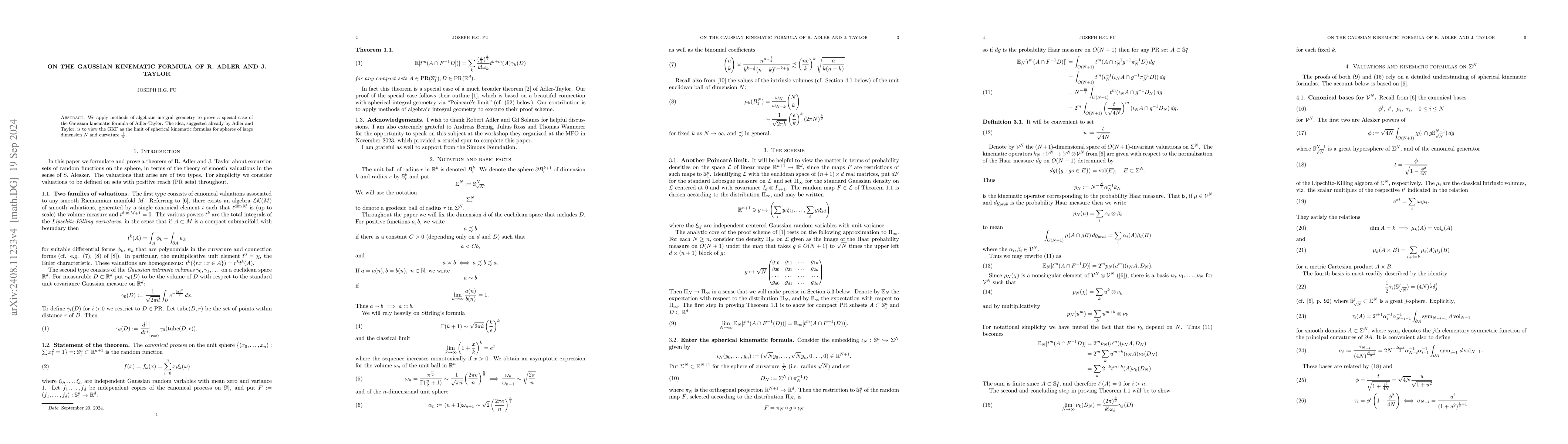 Summary: This paper employs algebraic integral geometry techniques to validate a specific instance of the Gaussian kinematic formula by Adler and Taylor, conceptualizing it as the limit of high-dimensional spherical kinematic formulas.