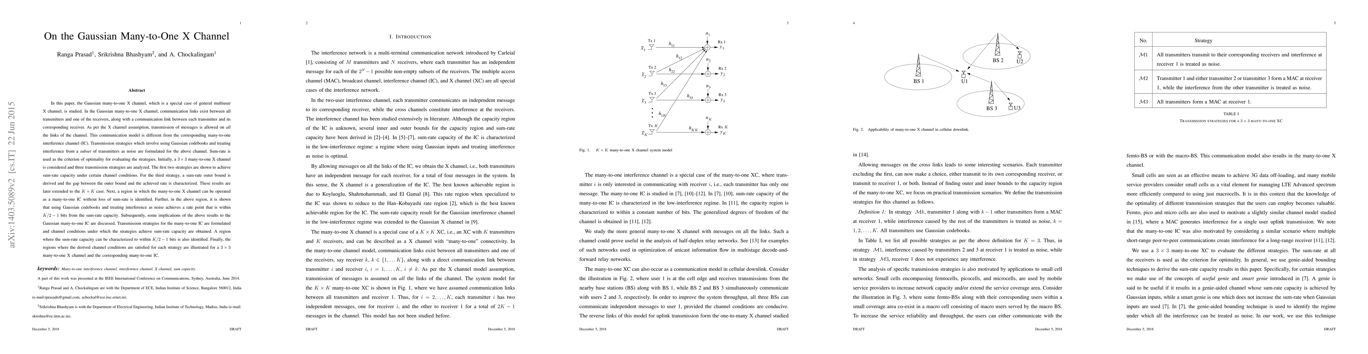 In this paper, the Gaussian many-to-one X channel, which is a special case of general multiuser X channel, is studied. In the Gaussian many-to-one X channel, communication links exist between all transmitters and one of the receivers, along with a communication link between each transmitter and its corresponding receiver. As per the X channel assumption, transmission of messages is allowed on all the links of the channel. This communication model is different from the corresponding many-to-one interference channel (IC). Transmission strategies which involve using Gaussian codebooks and treating interference from a subset of transmitters as noise are formulated for the above channel. Sum-rate is used as the criterion of optimality for evaluating the strategies. Initially, a $3 \times 3$ many-to-one X channel is considered and three transmission strategies are analyzed. The first two strategies are shown to achieve sum-rate capacity under certain channel conditions. For the third strategy, a sum-rate outer bound is derived and the gap between the outer bound and the achieved rate is characterized. These results are later extended to the $K \times K$ case. Next, a region in which the many-to-one X channel can be operated as a many-to-one IC without loss of sum-rate is identified. Further, in the above region, it is shown that using Gaussian codebooks and treating interference as noise achieves a rate point that is within $K/2 -1$ bits from the sum-rate capacity. Subsequently, some implications of the above results to the Gaussian many-to-one IC are discussed. Transmission strategies for the many-to-one IC are formulated and channel conditions under which the strategies achieve sum-rate capacity are obtained. A region where the sum-rate capacity can be characterized to within $K/2-1$ bits is also identified.