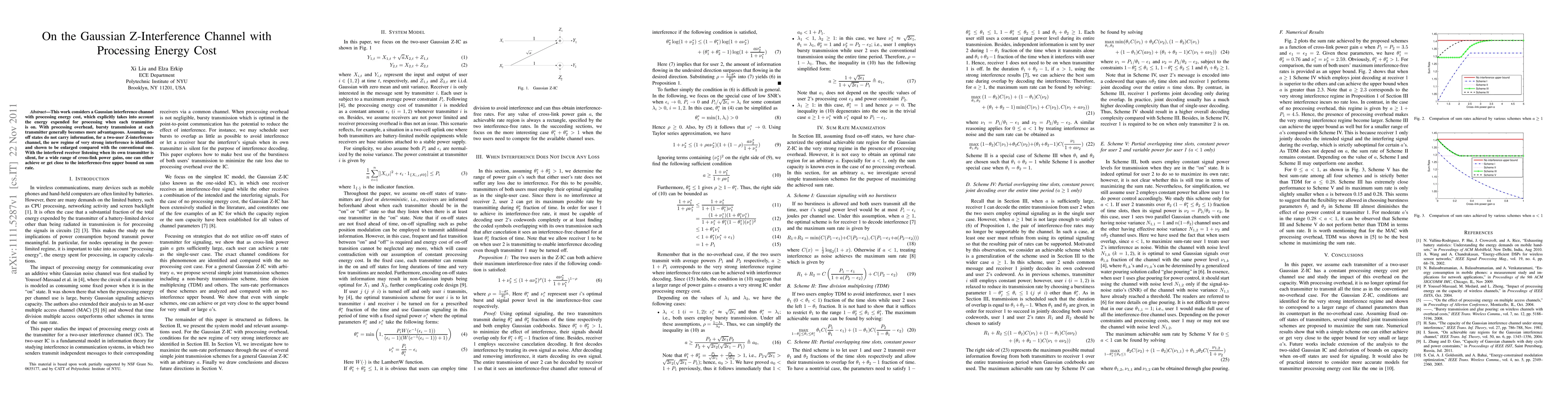 This paper investigates the Gaussian Z-interference channel with processing energy costs, demonstrating that bursty transmission is more beneficial due to energy overhead. It identifies a new regime of very strong interference and shows that under certain conditions, the sum rate can approach the interference-free upper bound.