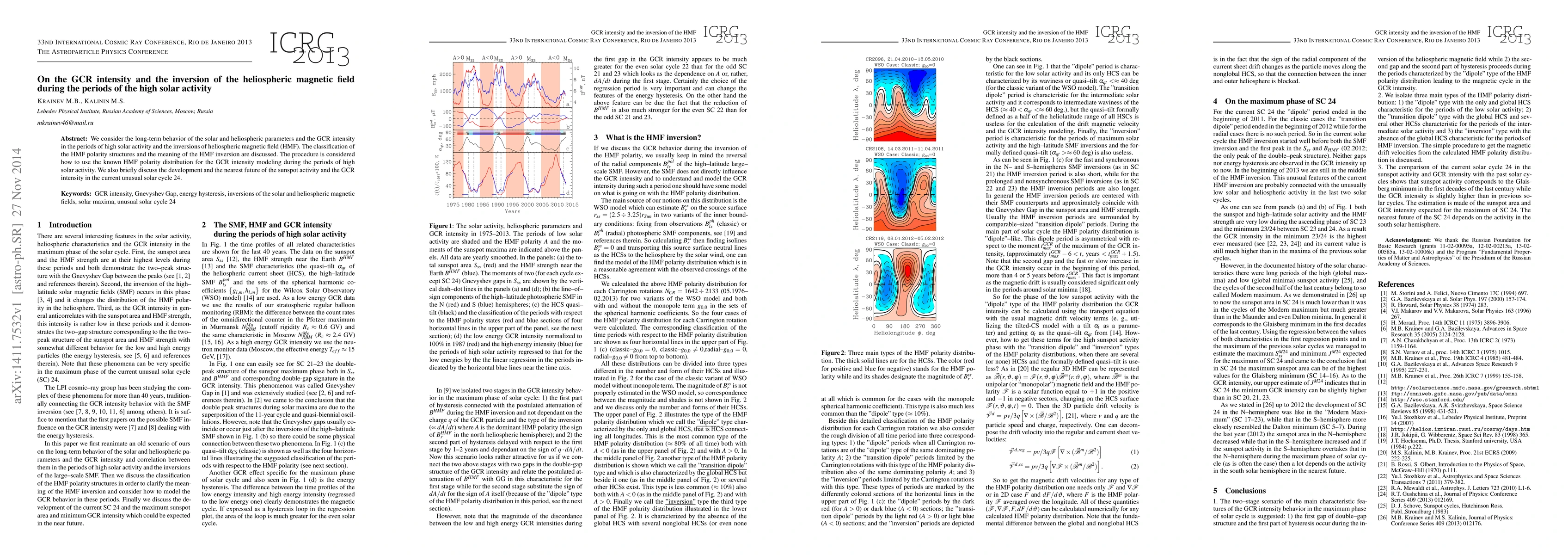 We consider the long-term behavior of the solar and heliospheric parameters and the GCR intensity in the periods of high solar activity and the inversions of heliospheric magnetic field (HMF). The classification of the HMF polarity structures and the meaning of the HMF inversion are discussed. The procedure is considered how to use the known HMF polarity distribution for the GCR intensity modeling during the periods of high solar activity. We also briefly discuss the development and the nearest future of the sunspot activity and the GCR intensity in the current unusual solar cycle 24.