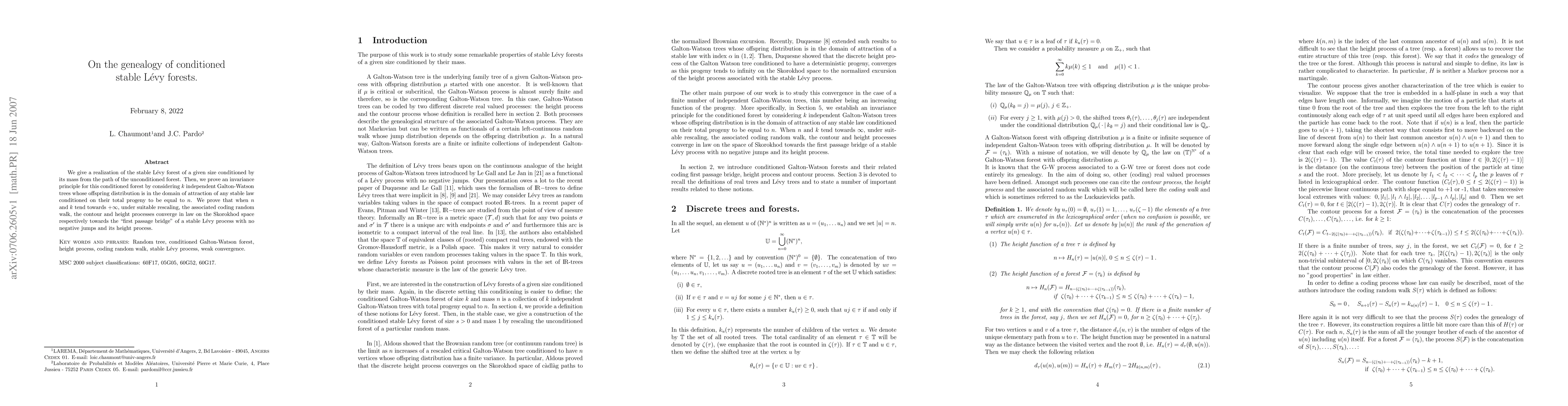 We give a realization of the stable L\'evy forest of a given size conditioned by its mass from the path of the unconditioned forest. Then, we prove an invariance principle for this conditioned forest by considering $k$ independent Galton-Watson trees whose offspring distribution is in the domain of attraction of any stable law conditioned on their total progeny to be equal to $n$. We prove that when $n$ and $k$ tend towards $+\infty$, under suitable rescaling, the associated coding random walk, the contour and height processes converge in law on the Skorokhod space respectively towards the "first passage bridge" of a stable L\'evy process with no negative jumps and its height process.
