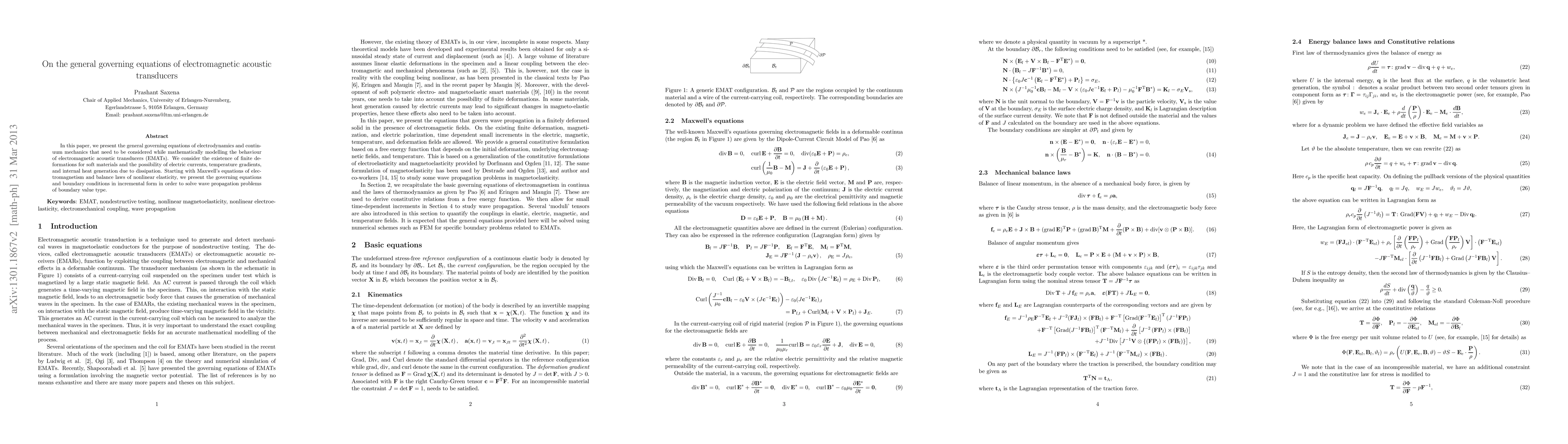 In this paper, we present the general governing equations of electrodynamics and continuum mechanics that need to be considered while mathematically modelling the behaviour of electromagnetic acoustic transducers (EMATs). We consider the existence of finite deformations for soft materials and the possibility of electric currents, temperature gradients, and internal heat generation due to dissipation. Starting with Maxwell's equations of electromagnetism and balance laws of nonlinear elasticity, we present the governing equations and boundary conditions in incremental form in order to solve wave propagation problems of boundary value type.