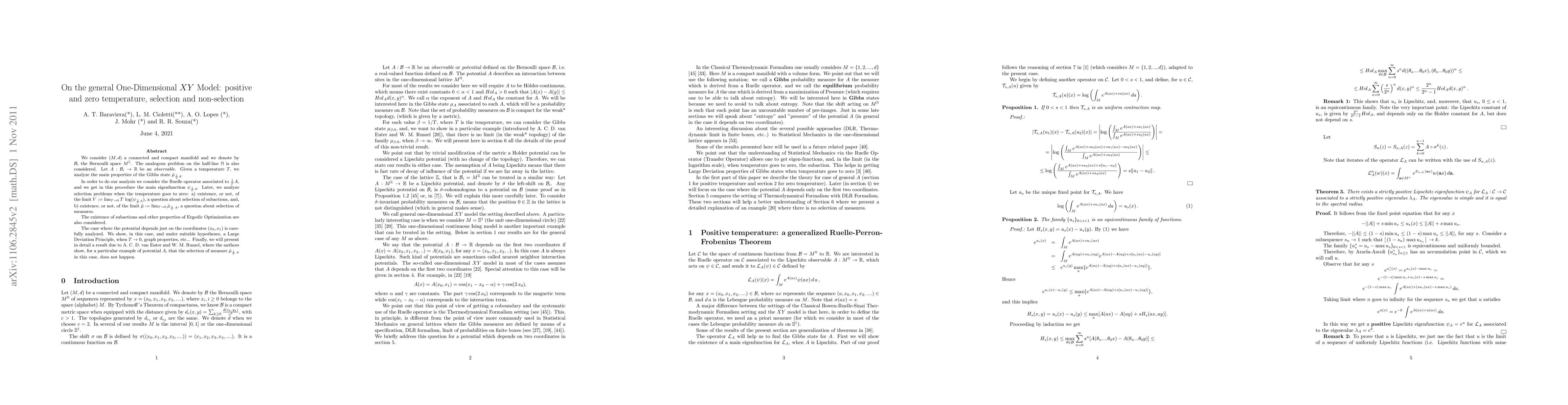 This research paper investigates the one-dimensional XY model at positive and zero temperatures, focusing on selection problems related to subactions and measures, with implications for Ergodic Optimization.