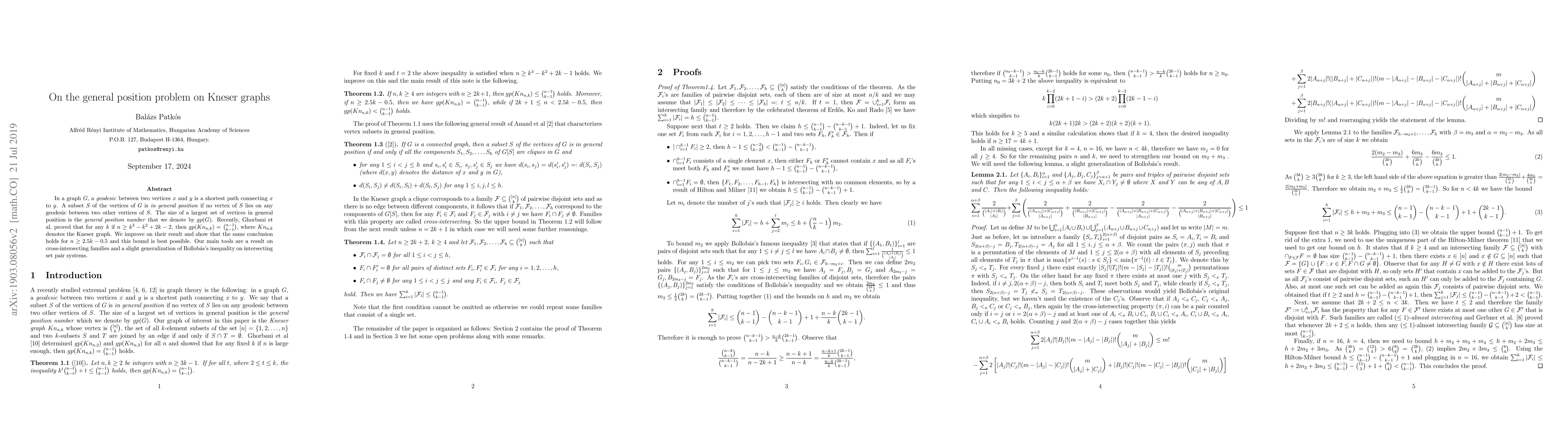 Researchers improved a previous result on Kneser graphs, showing that for large enough n, the size of the largest set in general position is equal to the binomial coefficient inom{n-1}{k-1}, with a new bound of n >= 2.5k - 0.5.
