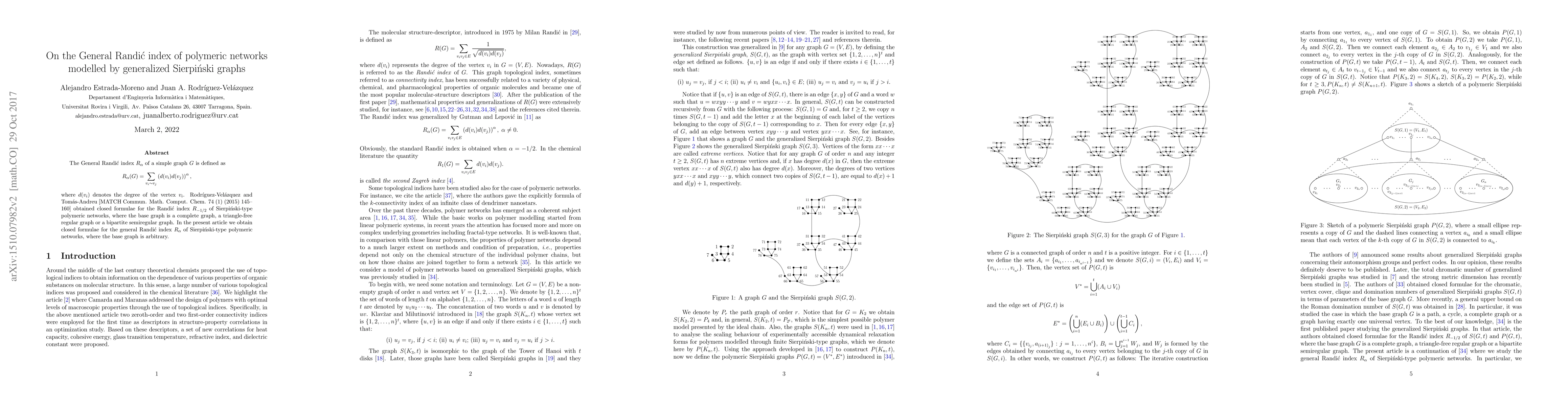 The General Randi\'c index $R_\alpha$ of a simple graph $G$ is defined as \[ R_\alpha(G)=\sum_{v_{i}\sim v_{j}} (\delta_{i}\delta_{j})^\alpha, \] where $\delta_i$ denotes the degree of the vertex $v_i$. Rodr\'iguez-Vel\'azquez and Tom\'as-Andreu [MATCH Commun. Math. Comput. Chem. 74 (1) (2015) 145--160] obtained closed formulae for the Randi\'c index $R_{-1/2}$ of Sierpi\'nski-type polymeric networks, where the base graph is a complete graph, a triangle-free regular graph or a bipartite semiregular graph. In the present article we obtain closed formulae for the general Randi\'c index $R_{\alpha}$ of Sierpi\'nski-type polymeric networks, where the base graph is arbitrary.