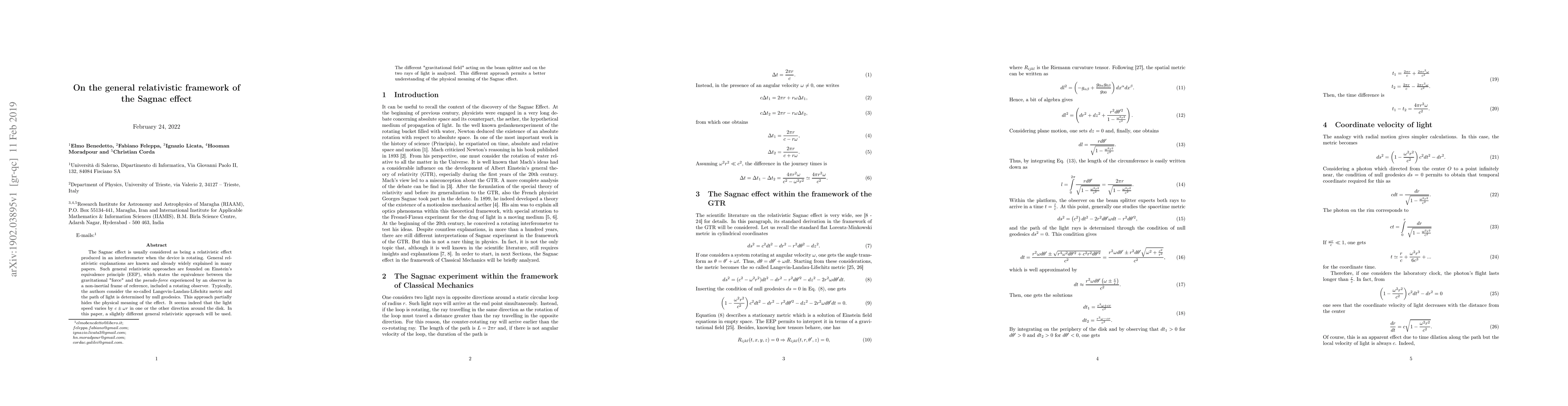 The Sagnac effect is usually considered as being a relativistic effect produced in an interferometer when the device is rotating. General relativistic explanations are known and already widely explained in many papers. Such general relativistic approaches are founded on Einstein's equivalence principle (EEP), which states the equivalence between the gravitational "force" and the pseudo-force experienced by an observer in a non-inertial frame of reference, included a rotating observer. Typically, the authors consider the so-called Langevin-Landau-Lifschitz metric and the path of light is determined by null geodesics. This approach partially hides the physical meaning of the effect. It seems indeed that the light speed varies by c\pm\omega r in one or the other direction around the disk. In this paper, a slightly different general relativistic approach will be used. The different "gravitational field" acting on the beam splitter and on the two rays of light is analyzed. This different approach permits a better understanding of the physical meaning of the Sagnac effect.