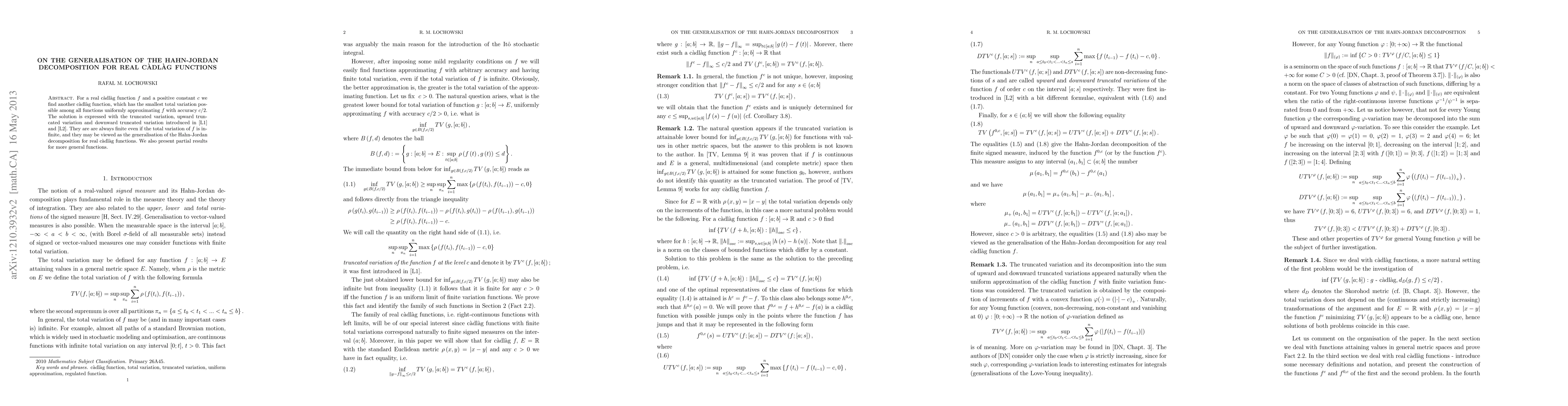 For a real c\`{a}dl\`{a}g function f and a positive constant c we find another c\`{a}dl\`{a}g function, which has the smallest total variation pos- sible among all functions uniformly approximating f with accuracy c/2. The solution is expressed with the truncated variation, upward truncated variation and downward truncated variation introduced in [L1] and [L2]. They are always finite even if the total variation of f is infinite, and they may be viewed as the generalisation of the Hahn-Jordan decomposition for real c\`{a}dl\`{a}g functions. We also present partial results for more general functions.