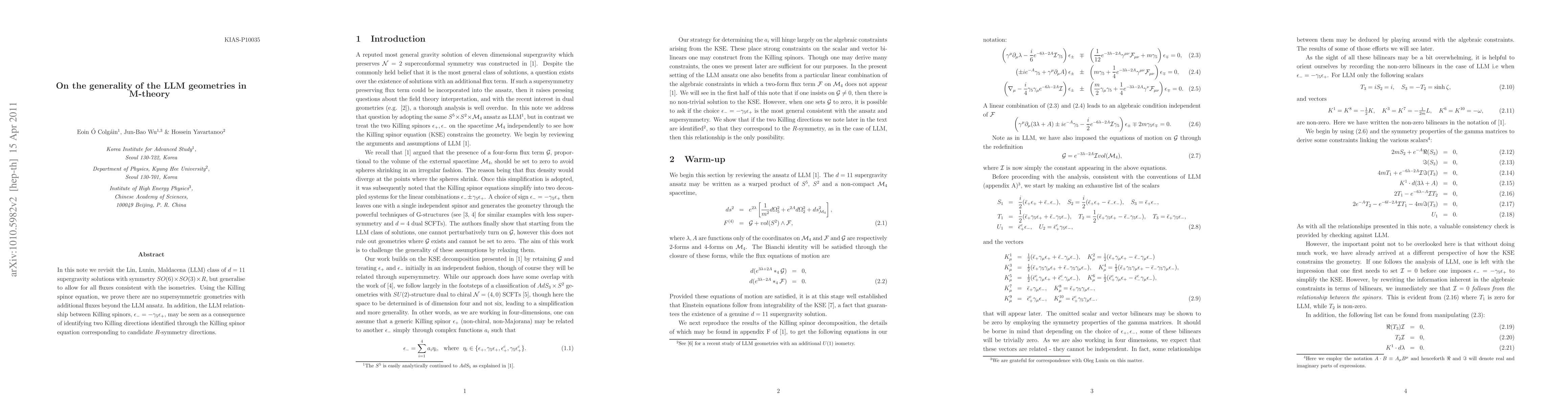 In this note we revisit the Lin, Lunin, Maldacena (LLM) class of d=11 supergravity solutions with symmetry SO(6) X SO(3) X R, but generalise to allow for all fluxes consistent with the isometries. Using the Killing spinor equation, we prove there are no supersymmetric geometries with additional fluxes beyond the LLM ansatz. In addition, the LLM relationship between Killing spinors, \epsilon_- = - \gamma_5 \epsilon_+, may be seen as a consequence of identifying two Killing directions identified through the Killing spinor equation corresponding to candidate R-symmetry directions.