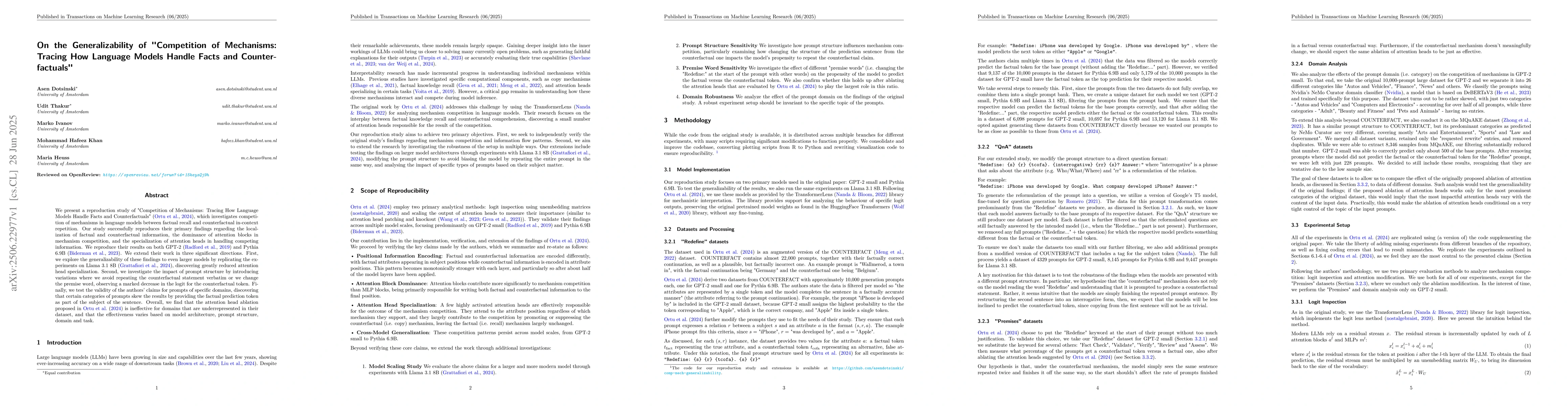 We present a reproduction study of "Competition of Mechanisms: Tracing How Language Models Handle Facts and Counterfactuals" (Ortu et al., 2024), which investigates competition of mechanisms in language models between factual recall and counterfactual in-context repetition. Our study successfully reproduces their primary findings regarding the localization of factual and counterfactual information, the dominance of attention blocks in mechanism competition, and the specialization of attention heads in handling competing information. We reproduce their results on both GPT-2 (Radford et al., 2019) and Pythia 6.9B (Biderman et al., 2023). We extend their work in three significant directions. First, we explore the generalizability of these findings to even larger models by replicating the experiments on Llama 3.1 8B (Grattafiori et al., 2024), discovering greatly reduced attention head specialization. Second, we investigate the impact of prompt structure by introducing variations where we avoid repeating the counterfactual statement verbatim or we change the premise word, observing a marked decrease in the logit for the counterfactual token. Finally, we test the validity of the authors' claims for prompts of specific domains, discovering that certain categories of prompts skew the results by providing the factual prediction token as part of the subject of the sentence. Overall, we find that the attention head ablation proposed in Ortu et al. (2024) is ineffective for domains that are underrepresented in their dataset, and that the effectiveness varies based on model architecture, prompt structure, domain and task.