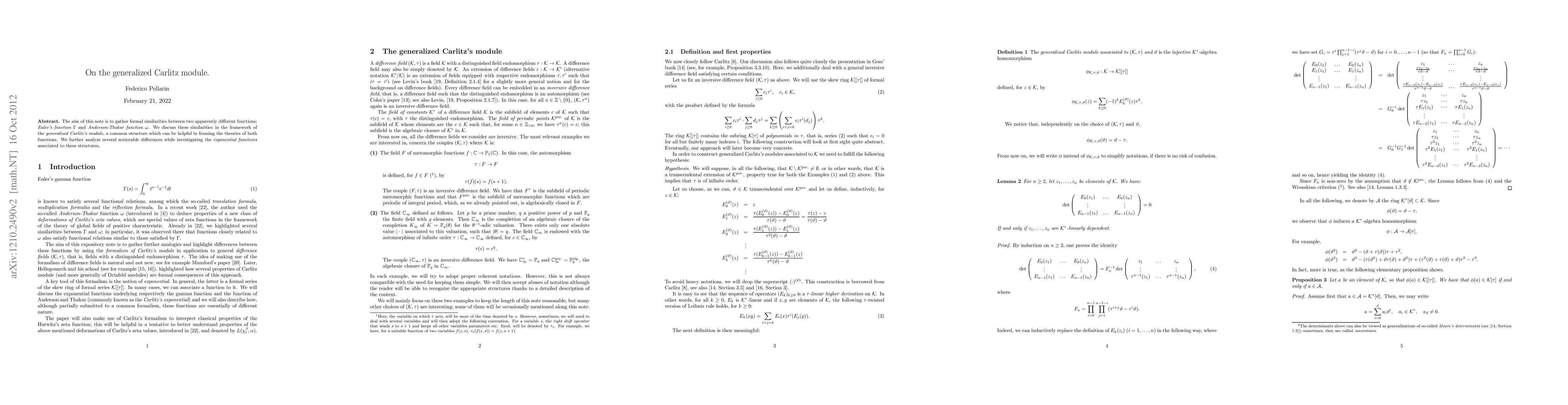 The aim of this note is to gather formal similarities between two apparently different functions; {\em Euler's function} $\Gamma$ and {\em Anderson-Thakur function} $\omega$. We discuss these similarities in the framework of the {\em generalized Carlitz's module}, a common structure which can be helpful in framing the theories of both functions. We further analyze several noticeable differences while investigating the {\em exponential functions} associated to these structures.