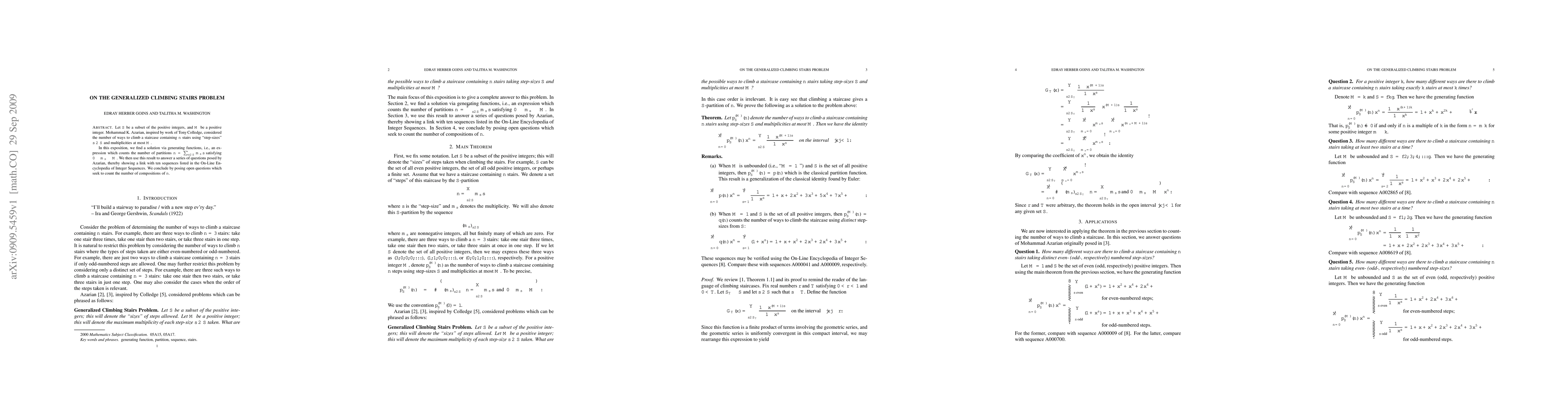 This paper solves the generalized climbing stairs problem using generating functions, finding a way to count the number of ways to climb n stairs with step-sizes from a subset S and multiplicities up to M, and poses open questions about counting compositions of n.