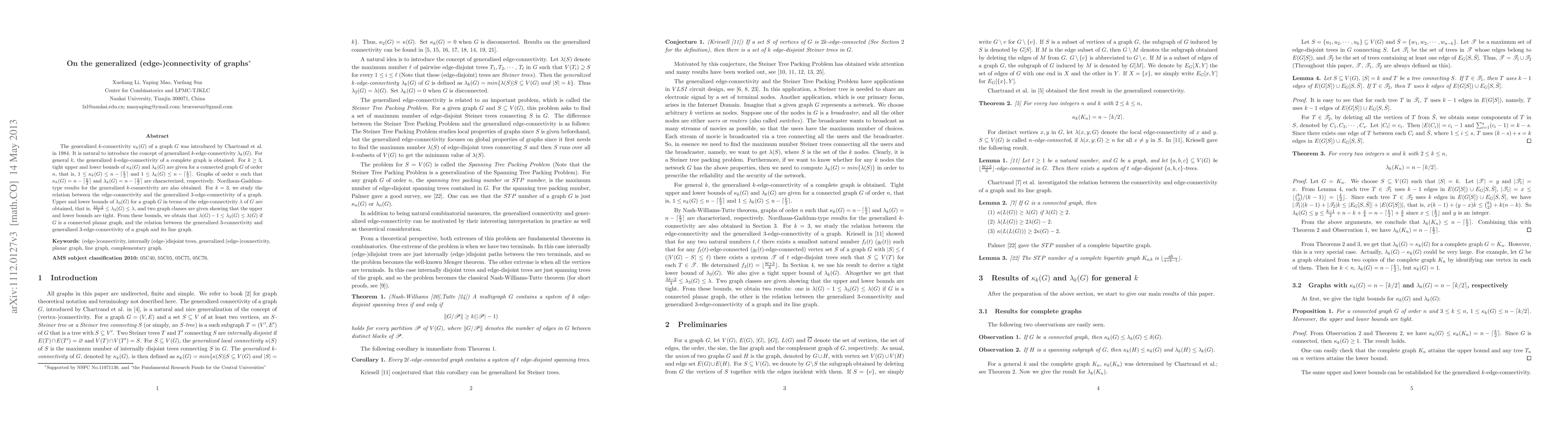 This paper introduces generalized $k$-connectivity and $k$-edge-connectivity concepts, providing tight bounds for these measures in complete graphs and connected graphs. It characterizes graphs achieving maximum generalized connectivity and explores Nordhaus-Gaddum-type results, specifically deriving bounds for $\lambda_3(G)$ in terms of edge-connectivity $\lambda$ for $k=3$.