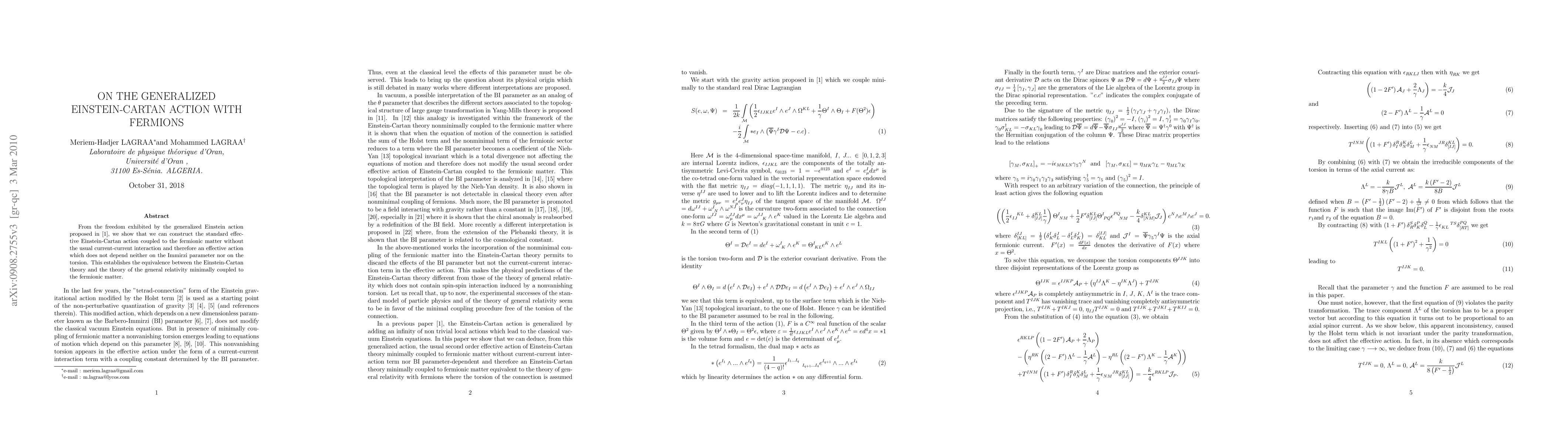 From the freedom exhibited by the generalized Einstein action proposed in [1], we show that we can construct the standard effective Einstein-Cartan action coupled to the fermionic matter without the usual current-current interaction and therefore an effective action which does not depend neither on the Immirzi parameter nor on the torsion. This establishes the equivalence between the Einstein-Cartan theory and the theory of the general relativity minimally coupled to the fermionic matter.