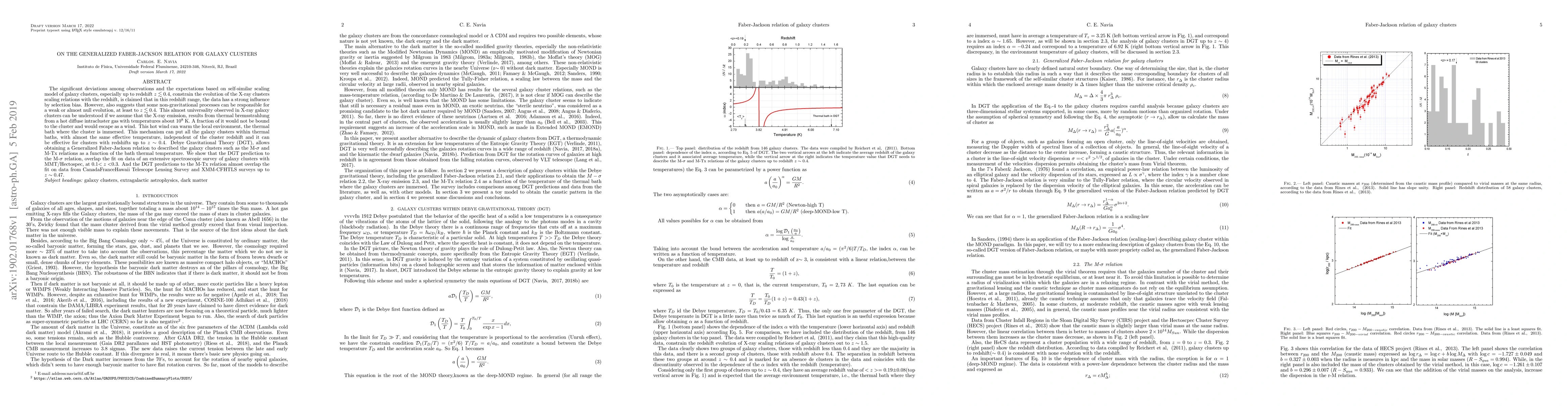 This paper explores deviations in galaxy cluster scaling relations up to redshift $z\lesssim 0.4$, suggesting non-gravitational processes may cause weak evolution. It proposes a hot wind mechanism that maintains similar effective temperatures across clusters, explaining the observed universality. The Debye Gravitational Theory (DGT) is used to derive a Generalized Faber-Jackson relation, which aligns well with observational data from spectroscopic and lensing surveys.