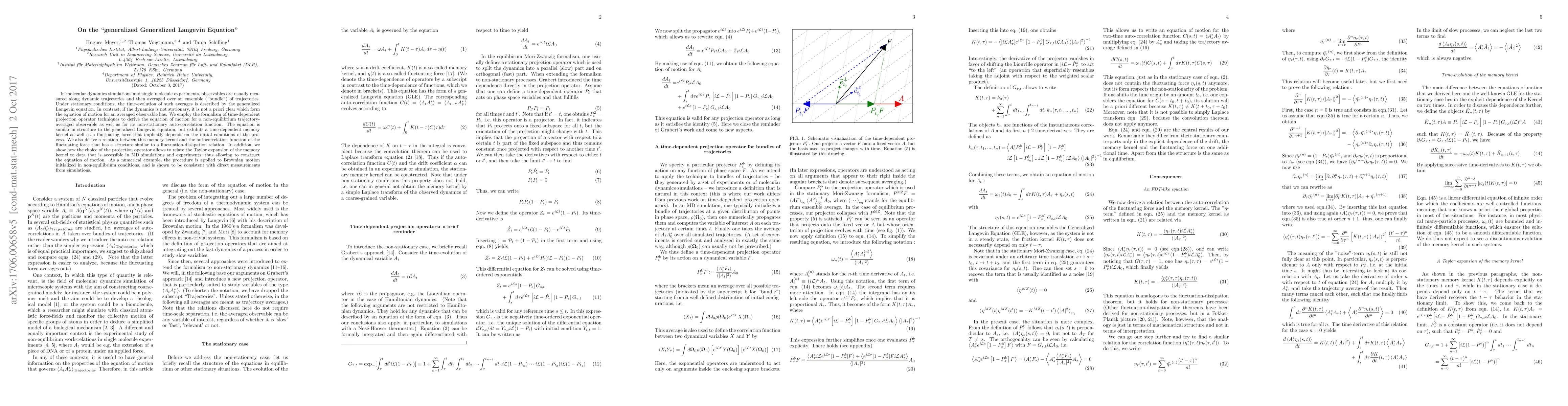 In molecular dynamics simulations and single molecule experiments, observables are usually measured along dynamic trajectories and then averaged over an ensemble ("bundle") of trajectories. Under stationary conditions, the time-evolution of such averages is described by the generalized Langevin equation. In contrast, if the dynamics is not stationary, it is not a priori clear which form the equation of motion for an averaged observable has. We employ the formalism of time-dependent projection operator techniques to derive the equation of motion for a non-equilibrium trajectory-averaged observable as well as for its non-stationary auto-correlation function. The equation is similar in structure to the generalized Langevin equation, but exhibits a time-dependent memory kernel as well as a fluctuating force that implicitly depends on the initial conditions of the process. We also derive a relation between this memory kernel and the autocorrelation function of the fluctuating force that has a structure similar to a fluctuation-dissipation relation. In addition, we show how the choice of the projection operator allows to relate the Taylor expansion of the memory kernel to data that is accessible in MD simulations and experiments, thus allowing to construct the equation of motion. As a numerical example, the procedure is applied to Brownian motion initialized in non-equilibrium conditions, and is shown to be consistent with direct measurements from simulations.