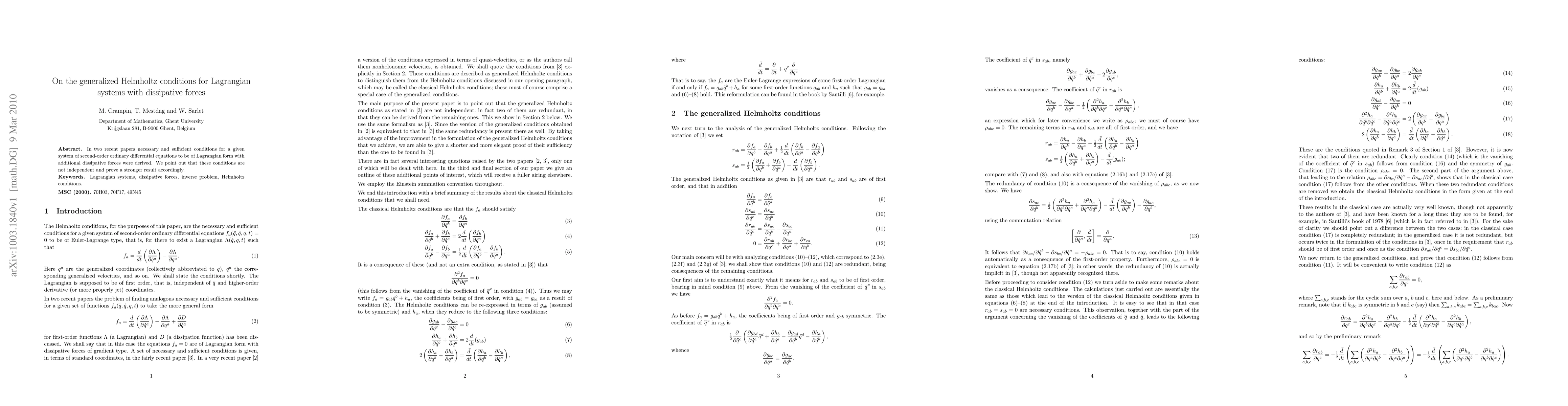 In two recent papers necessary and sufficient conditions for a given system of second-order ordinary differential equations to be of Lagrangian form with additional dissipative forces were derived. We point out that these conditions are not independent and prove a stronger result accordingly.