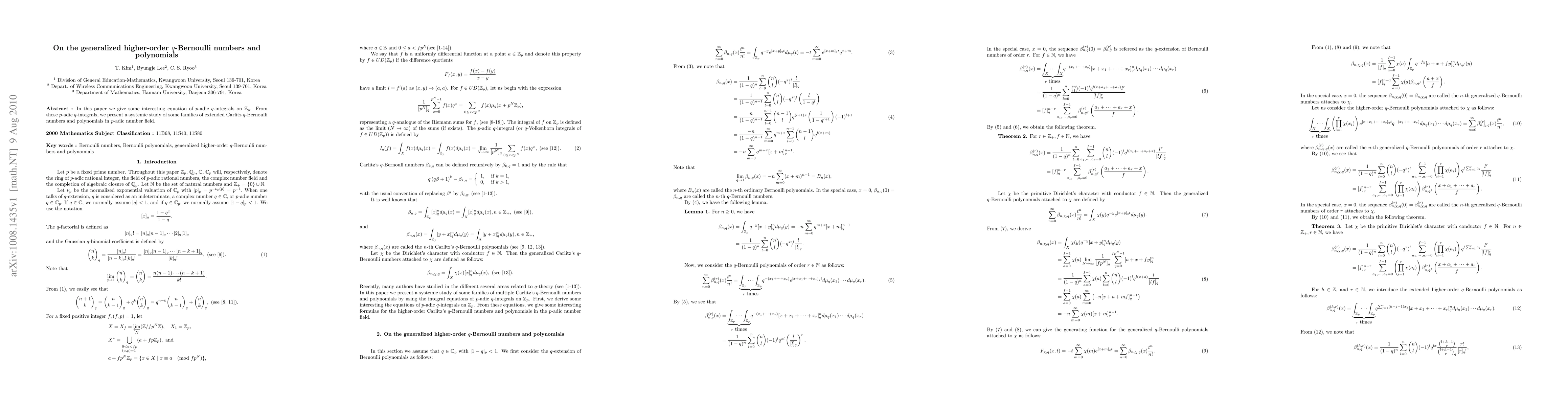 This paper explores p-adic q-integrals to study families of extended Carlitz q-Bernoulli numbers and polynomials in a p-adic number field, revealing new equations and insights.