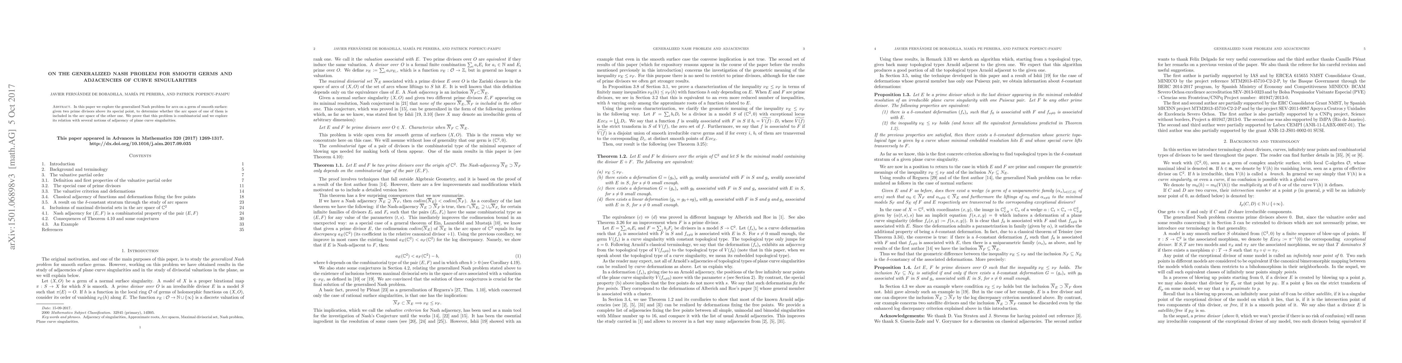 This paper investigates the generalized Nash problem concerning arcs on smooth surface germs, determining if the arc space of one prime divisor is contained within another's. It proves the problem's combinatorial nature and examines its connections to various adjacency concepts in plane curve singularities.