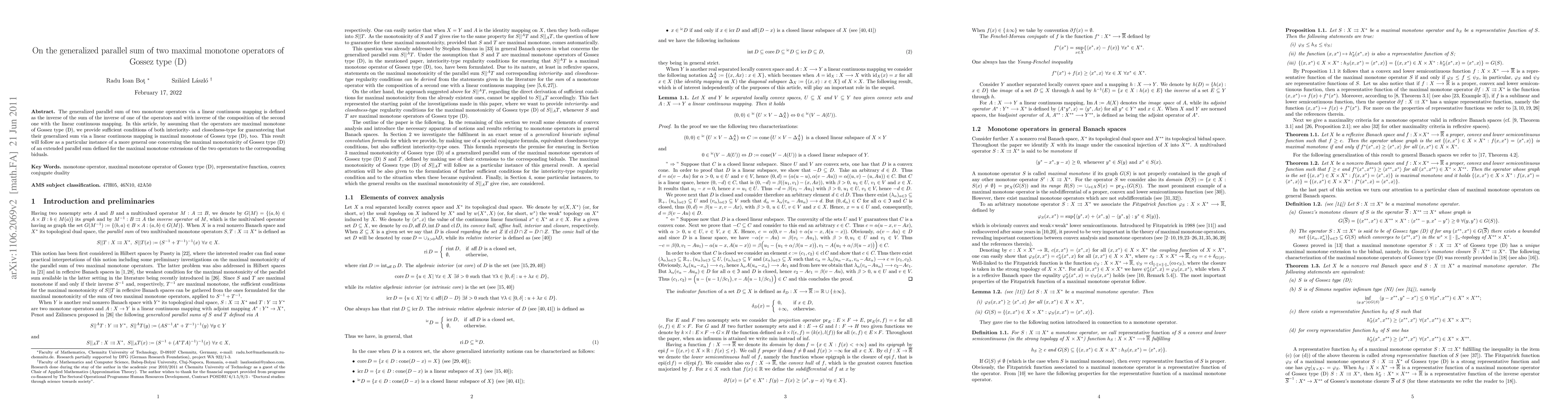 This paper investigates conditions for the maximality of the generalized parallel sum of two maximal monotone operators of Gossez type (D), ensuring it remains maximal monotone under certain assumptions.
