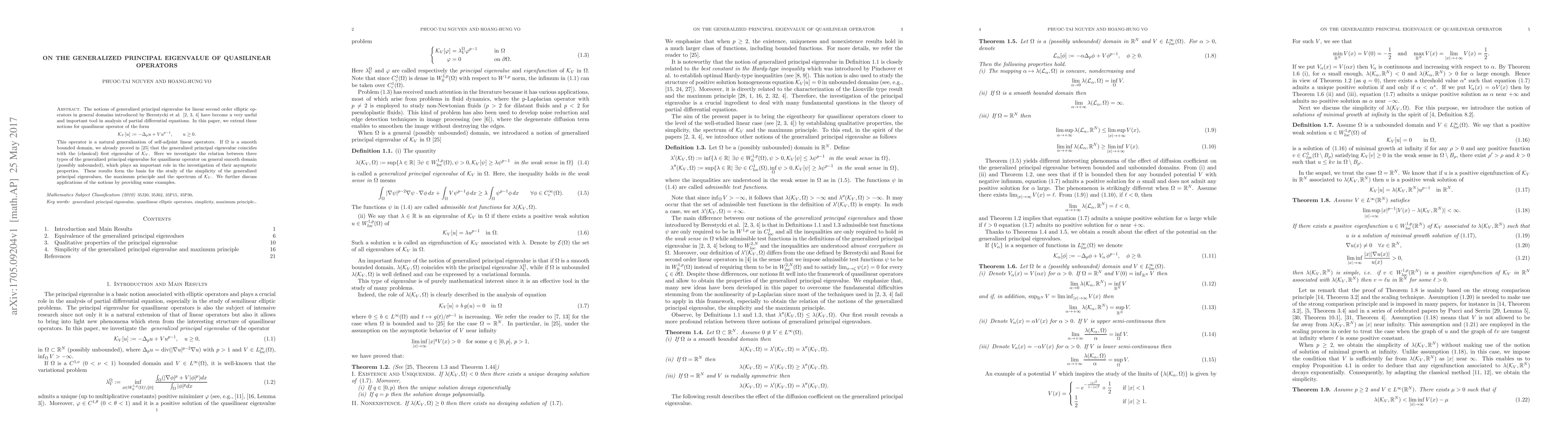 This paper extends the concept of generalized principal eigenvalue for quasilinear operators of the form $\CK_V[u]=-\Delta_p u +Vu^{p-1}$ to general smooth domains, exploring their asymptotic properties and applications. The study establishes the relationship between different types of generalized principal eigenvalues for these operators.