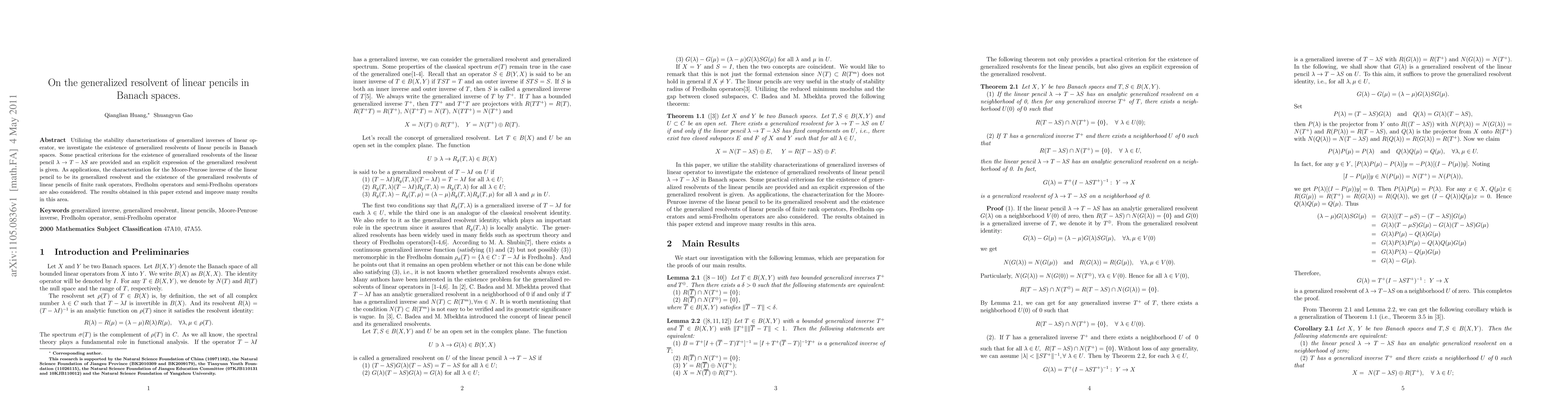 Utilizing the stability characterizations of generalized inverses of linear operator, we investigate the existence of generalized resolvents of linear pencils in Banach spaces. Some practical criterions for the existence of generalized resolvents of the linear pencil $\lambda\rightarrow T-\lambda S$ are provided and an explicit expression of the generalized resolvent is given. As applications, the characterization for the Moore-Penrose inverse of the linear pencil to be its generalized resolvent and the existence of the generalized resolvents of linear pencils of finite rank operators, Fredholm operators and semi-Fredholm operators are also considered. The results obtained in this paper extend and improve many results in this area.