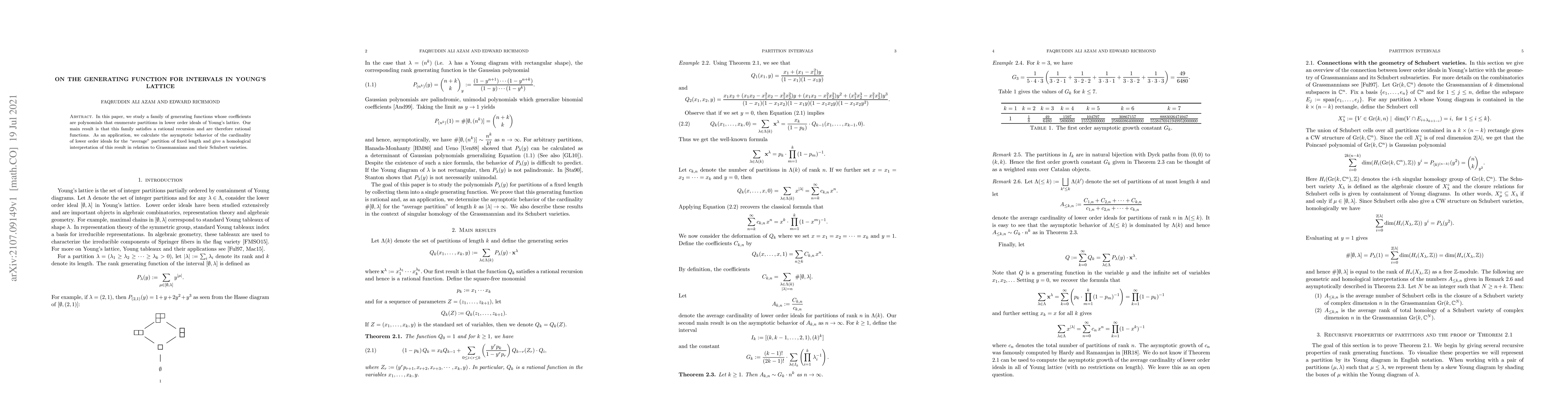 In this paper, we study a family of generating functions whose coefficients are polynomials that enumerate partitions in lower order ideals of Young's lattice. Our main result is that this family satisfies a rational recursion and are therefore rational functions. As an application, we calculate the asymptotic behavior of the cardinality of lower order ideals for the ``average" partition of fixed length and give a homological interpretation of this result in relation to Grassmannians and their Schubert varieties.