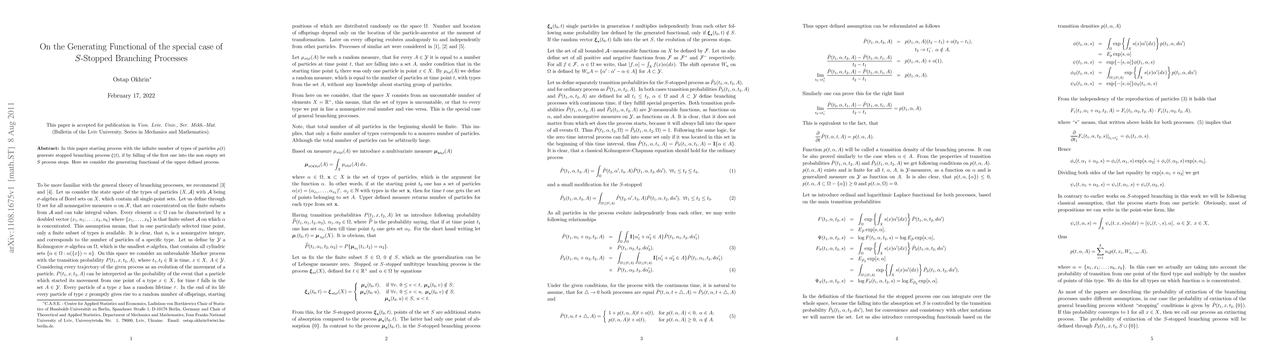 In this paper starting process with the infinite number of types of particles \mu(t) generate stopped branching process \xi(t), if by falling of the first one into the non empty set S process stops. Here we consider the generating functional of the upper defined process.