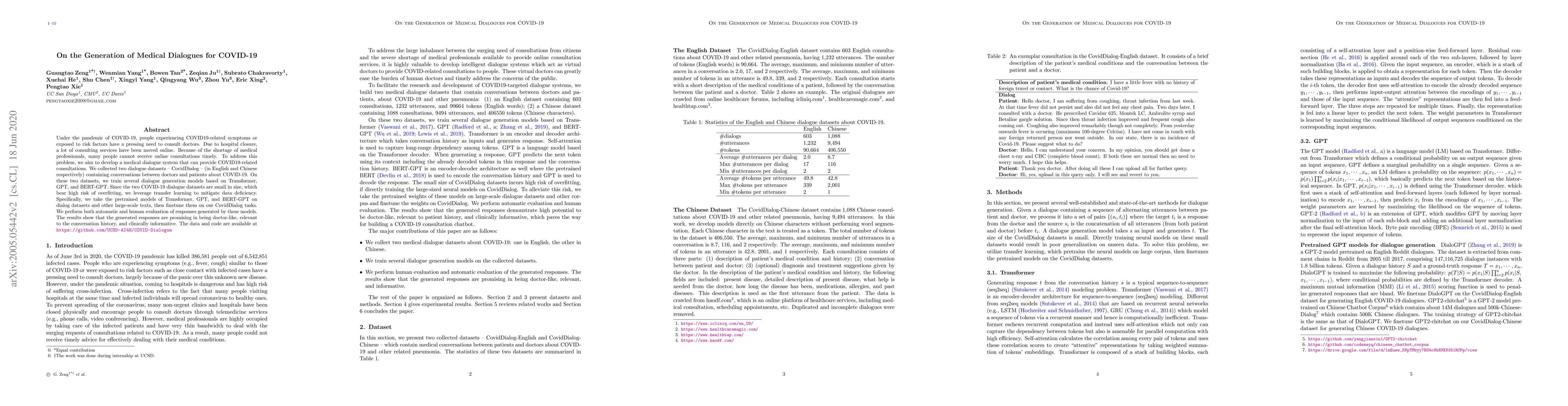 This paper develops a medical dialogue system to provide timely COVID-19 consultations by leveraging small dialogue datasets and transfer learning from pretrained Transformer, GPT, and BERT-GPT models. The results indicate that the generated responses are clinically informative and relevant, addressing the shortage of timely medical consultations during the pandemic.