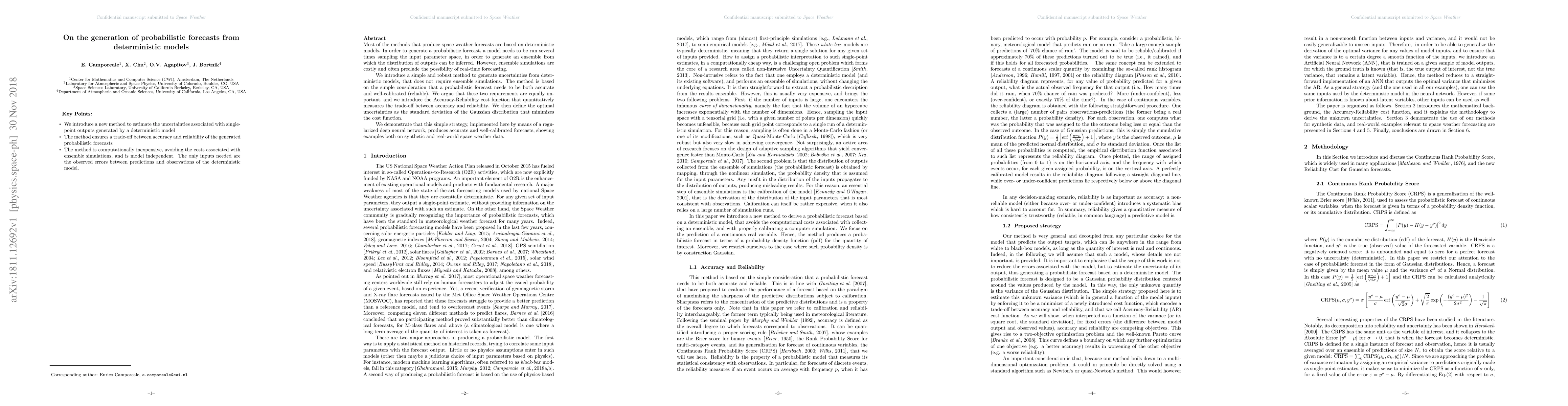 Researchers developed a method to generate probabilistic forecasts from deterministic models without needing ensemble simulations, using a cost function to balance accuracy and reliability, and achieved accurate and well-calibrated results on synthetic and real-world space weather data.