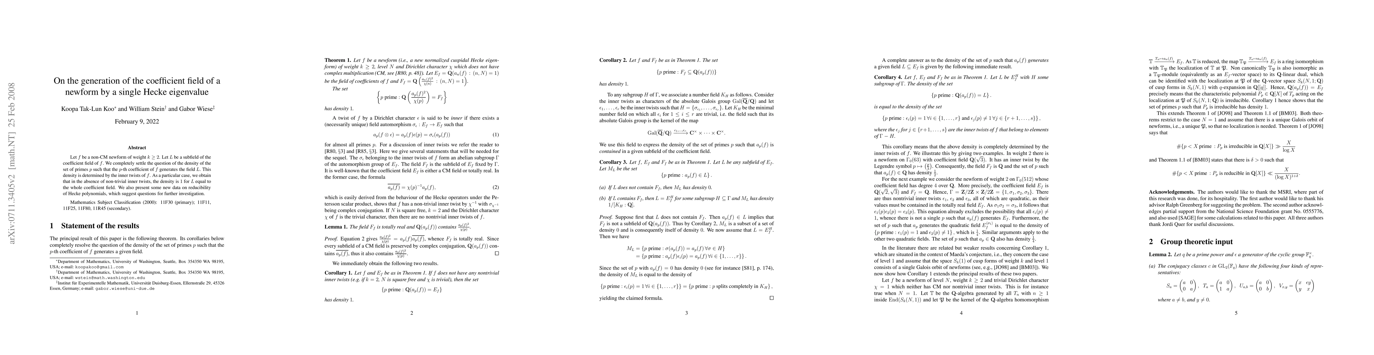 Let f be a non-CM newform of weight k > 1. Let L be a subfield of the coefficient field of f. We completely settle the question of the density of the set of primes p such that the p-th coefficient of f generates the field L. This density is determined by the inner twists of f. As a particular case, we obtain that in the absence of non-trivial inner twists, the density is 1 for L equal to the whole coefficient field. We also present some new data on reducibility of Hecke polynomials, which suggest questions for further investigation.