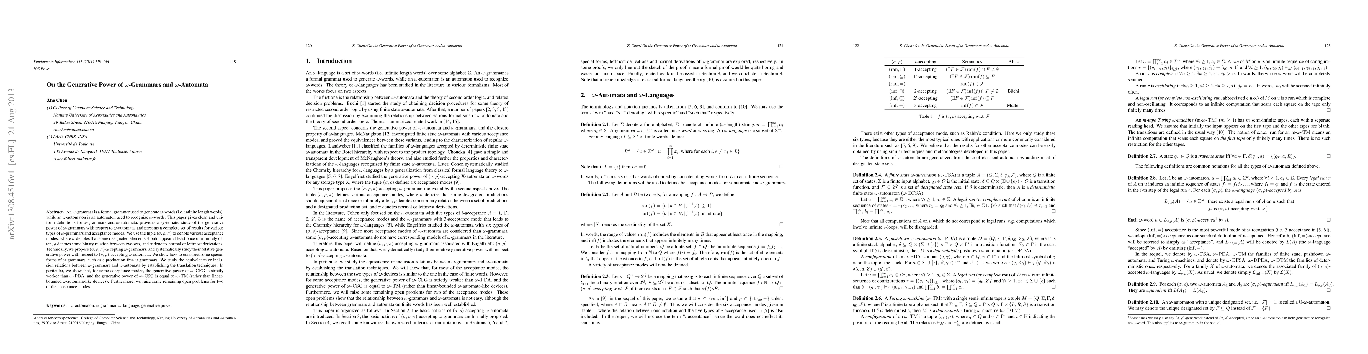 This paper systematically defines and studies omega-grammars and omega-automata for generating and recognizing infinite-length words, presenting a comprehensive analysis of their generative power and equivalence. It introduces (\sigma,\rho,\pi)-accepting omega-grammars and compares their power to (\sigma,\rho)-accepting omega-automata, revealing that the generative power of certain omega-grammars is strictly weaker than that of omega-PDA and that omega-CSG equals omega-TM.