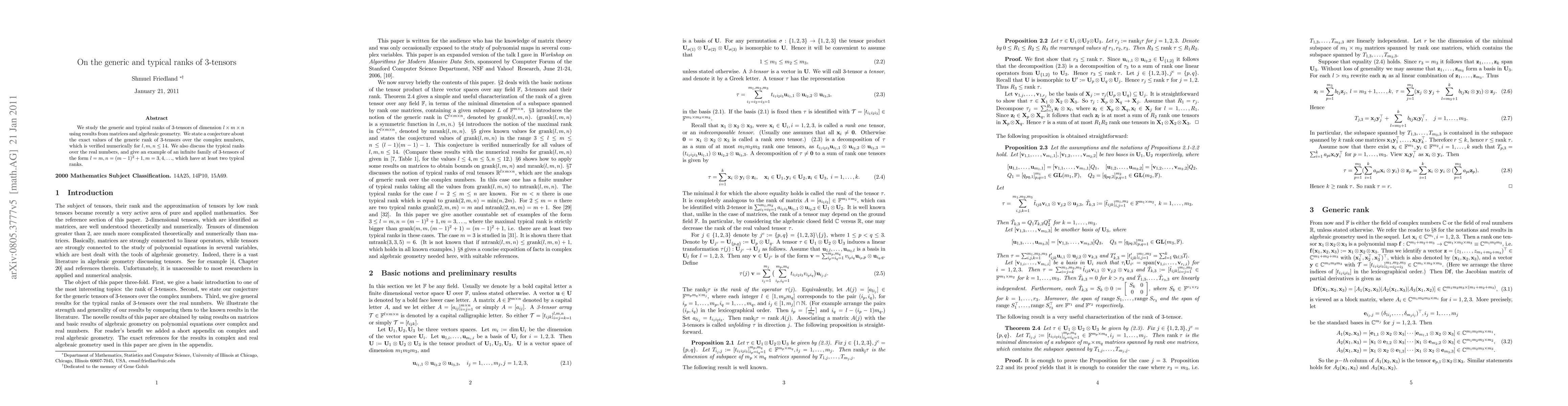This paper explores the generic and typical ranks of 3-tensors through algebraic geometry and matrix theory, proposing a conjecture on the generic rank over complex numbers supported by numerical verification for dimensions up to 14. It also examines typical ranks over real numbers and identifies an infinite family of tensors with multiple typical ranks.