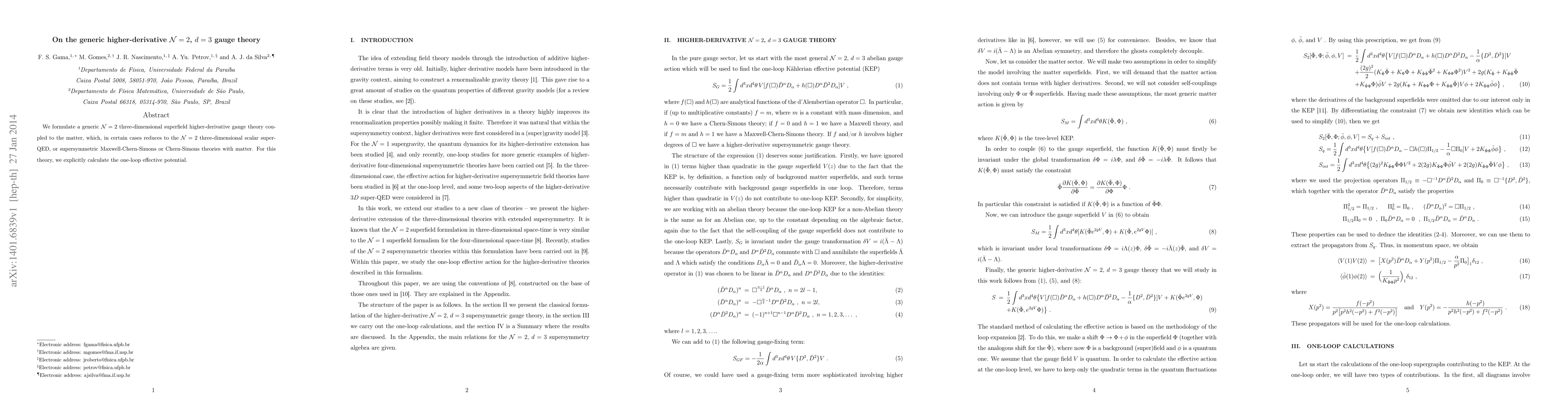 We formulate a generic $\mathcal{N}=2$ three-dimensional superfield higher-derivative gauge theory coupled to the matter, which, in certain cases reduces to the $\mathcal{N}=2$ three-dimensional scalar super-QED, or supersymmetric Maxwell-Chern-Simons or Chern-Simons theories with matter. For this theory, we explicitly calculate the one-loop effective potential.