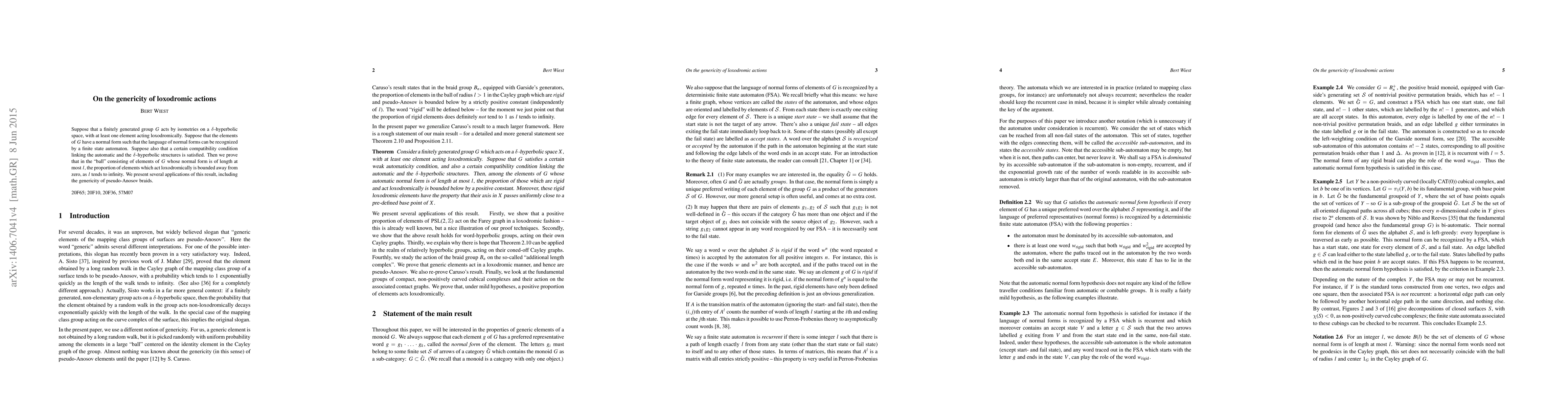 This paper proves that in finitely generated groups acting on a u03c3-hyperbolic space, with a weak automaticity condition and a compatibility condition, generic elements act loxodromically with a probability bounded away from zero. Applications include the genericity of pseudo-Anosov braids.