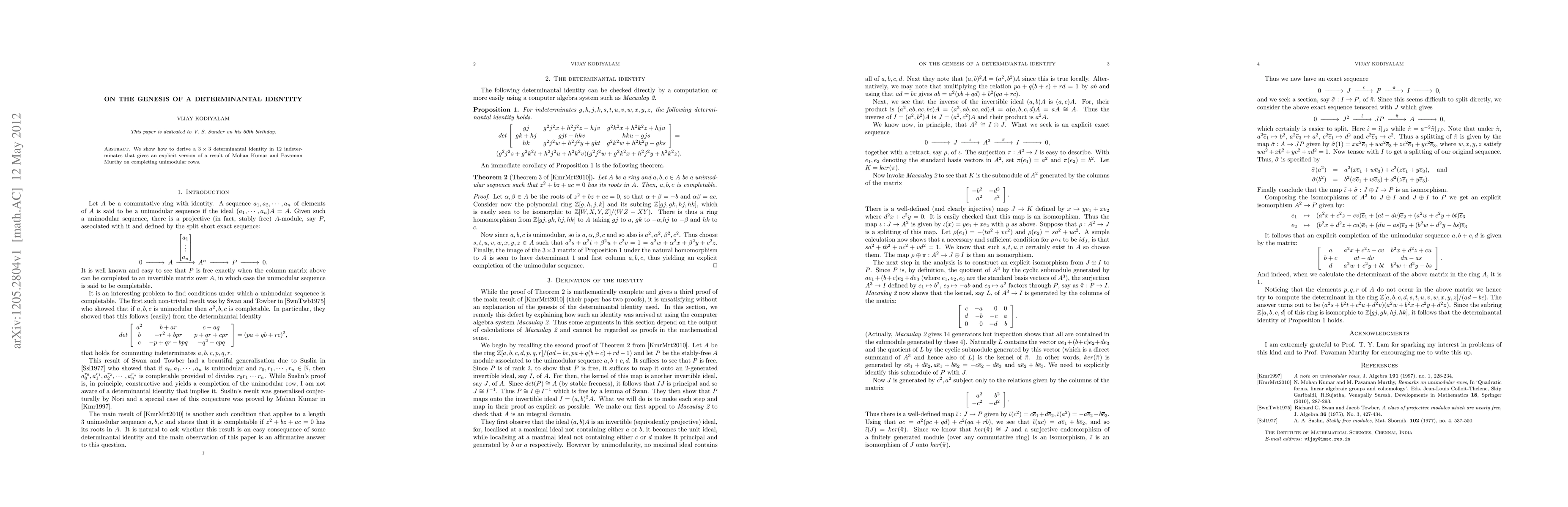 We show how to derive a $3 \times 3$ determinantal identity in 12 indeterminates that gives an explicit version of a result of Mohan Kumar and Pavaman Murthy on completing unimodular rows.