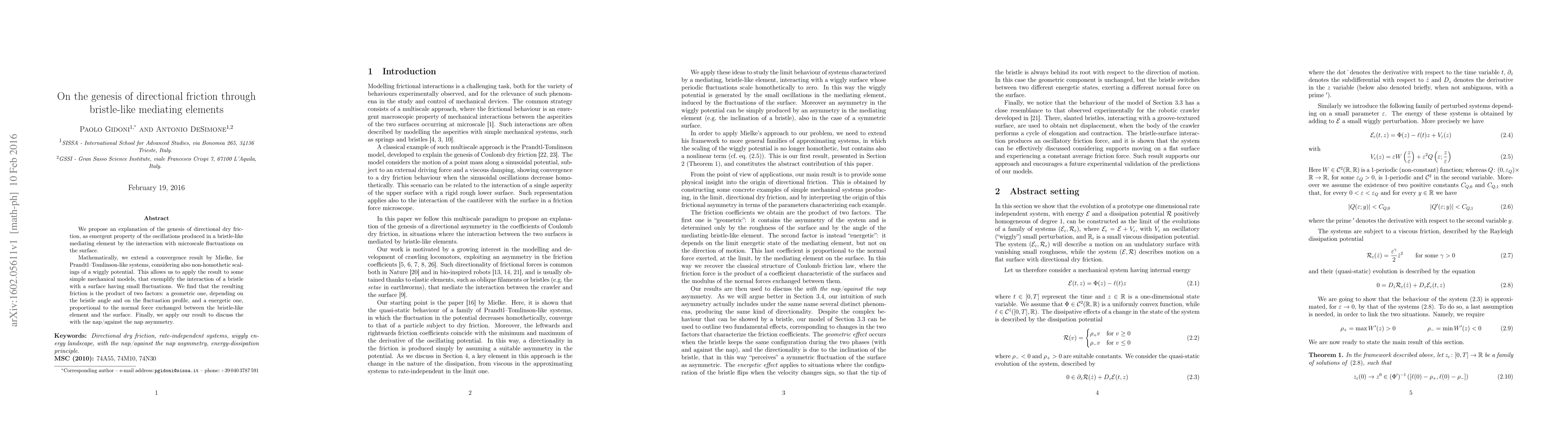 We propose an explanation of the genesis of directional dry friction, as emergent property of the oscillations produced in a bristle-like mediating element by the interaction with microscale fluctuations on the surface. Mathematically, we extend a convergence result by Mielke, for Prandtl-Tomlinson-like systems, considering also non-homothetic scalings of a wiggly potential. This allows us to apply the result to some simple mechanical models, that exemplify the interaction of a bristle with a surface having small fluctuations. We find that the resulting friction is the product of two factors: a geometric one, depending on the bristle angle and on the fluctuation profile, and a energetic one, proportional to the normal force exchanged between the bristle-like element and the surface. Finally, we apply our result to discuss the with the nap/against the nap asymmetry.