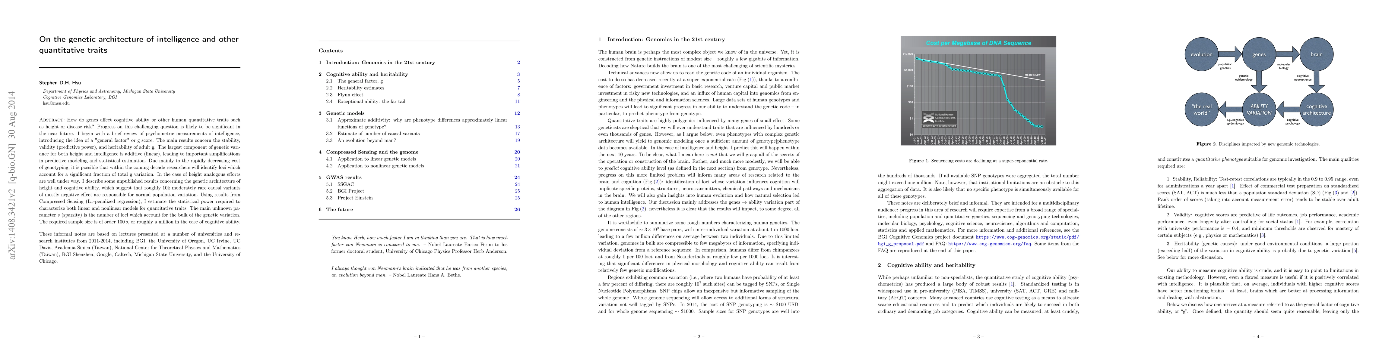 This paper explores the genetic underpinnings of intelligence and other quantitative traits like height, emphasizing the heritability and predictive power of a "general factor" or g score. It highlights the potential for identifying significant genetic loci within the next decade, driven by decreasing genotyping costs, and suggests that around 10k moderately rare variants contribute to normal population variation in traits.
