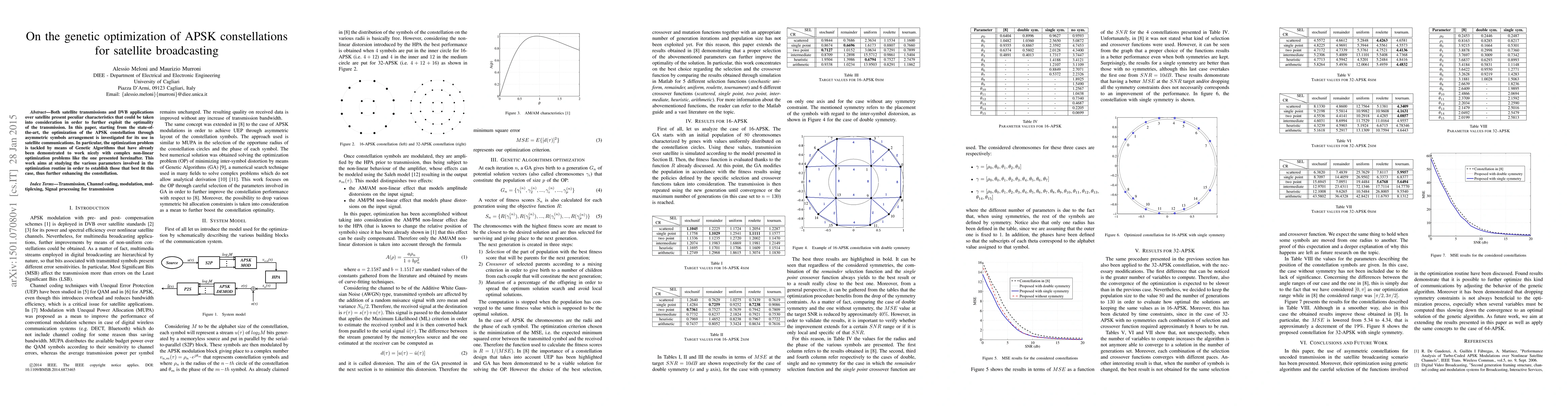 This paper explores the genetic optimization of APSK constellations for satellite broadcasting, employing Genetic Algorithms to arrange asymmetric symbols for improved transmission efficiency. The study aims to identify the optimal parameters for enhancing the constellation's performance.