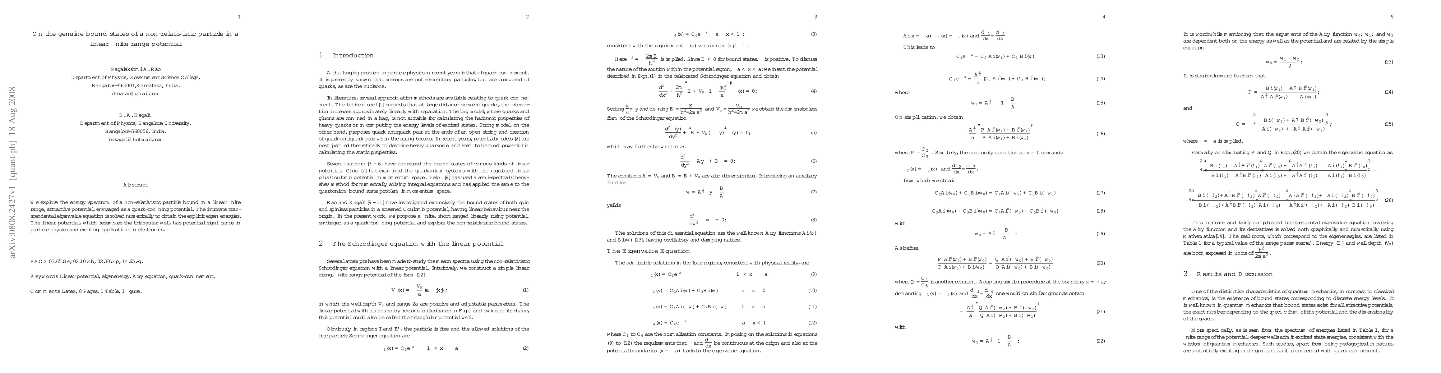 We explore the energy spectrum of a non-relativistic particle bound in a linear finite range, attractive potential, envisaged as a quark-confining potential. The intricate transcendental eigenvalue equation is solved numerically to obtain the explicit eigen-energies. The linear potential, which resembles the triangular well, has potential significance in particle physics and exciting applications in electronics.