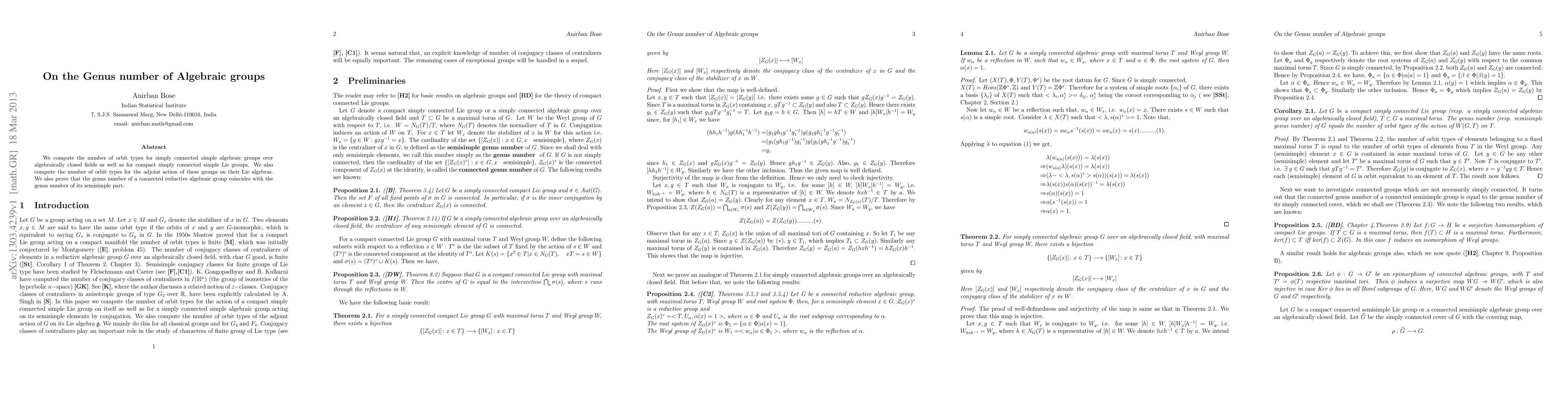 We compute the number of orbit types for simply connected simple algebraic groups over algebraically closed fields as well as for compact simply connected simple Lie groups. We also compute the number of orbit types for the adjoint action of these groups on their Lie algebras. We also prove that the genus number of a connected reductive algebraic group coincides with the genus number of its semisimple part.