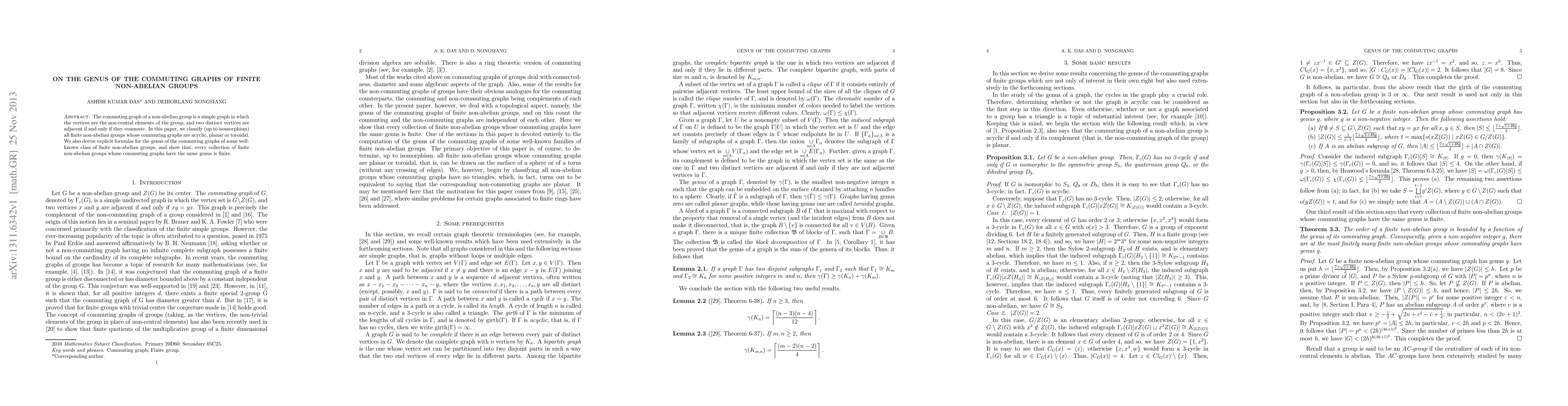 This paper classifies finite non-abelian groups with acyclic, planar, or toroidal commuting graphs, and provides explicit genus formulas for certain groups. It concludes that collections of such groups with the same genus are finite.