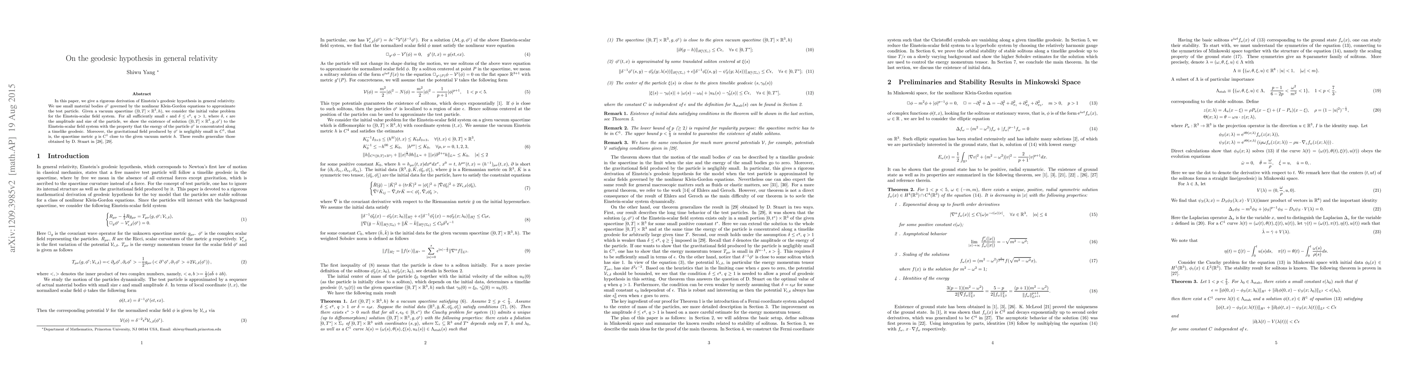The paper presents a detailed derivation and proof of the geodesic hypothesis using advanced mathematical tools such as scaling stable solitons and nonlinear wave equations, contributing to the theoretical framework of general relativity.