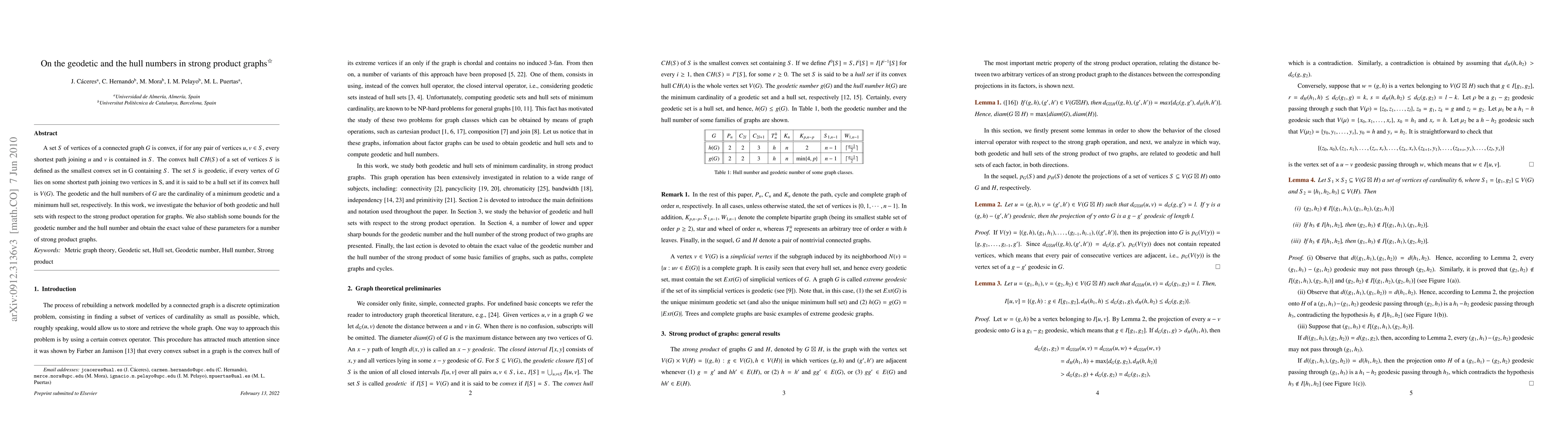 A set S of vertices of a connected graph G is convex, if for any pair of vertices u; v 2 S, every shortest path joining u and v is contained in S . The convex hull CH(S) of a set of vertices S is defined as the smallest convex set in G containing S. The set S is geodetic, if every vertex of G lies on some shortest path joining two vertices in S, and it is said to be a hull set if its convex hull is V(G). The geodetic and the hull numbers of G are the cardinality of a minimum geodetic and a minimum hull set, respectively. In this work, we investigate the behavior of both geodetic and hull sets with respect to the strong product operation for graphs. We also stablish some bounds for the geodetic number and the hull number and obtain the exact value of these parameters for a number of strong product graphs.